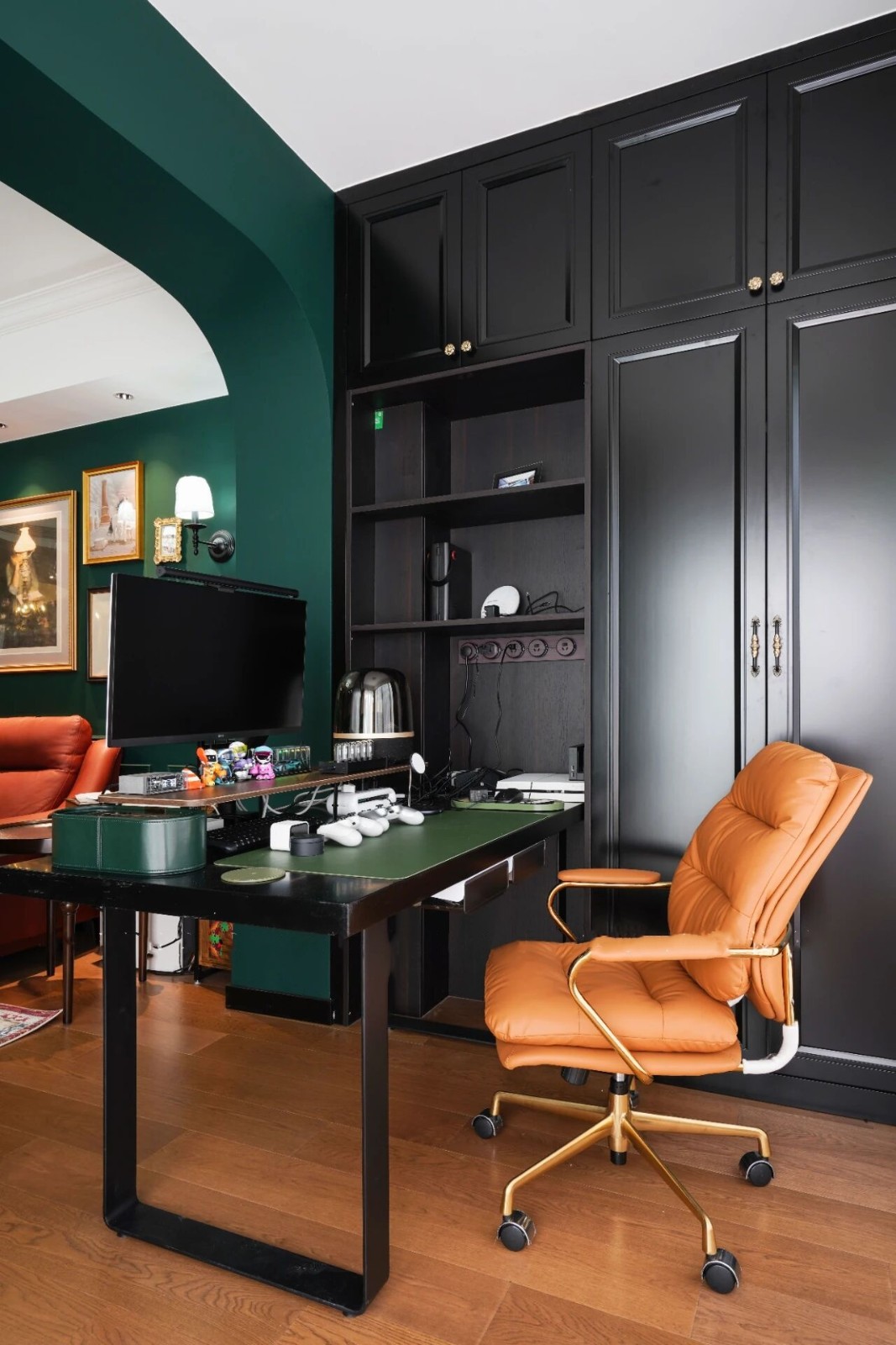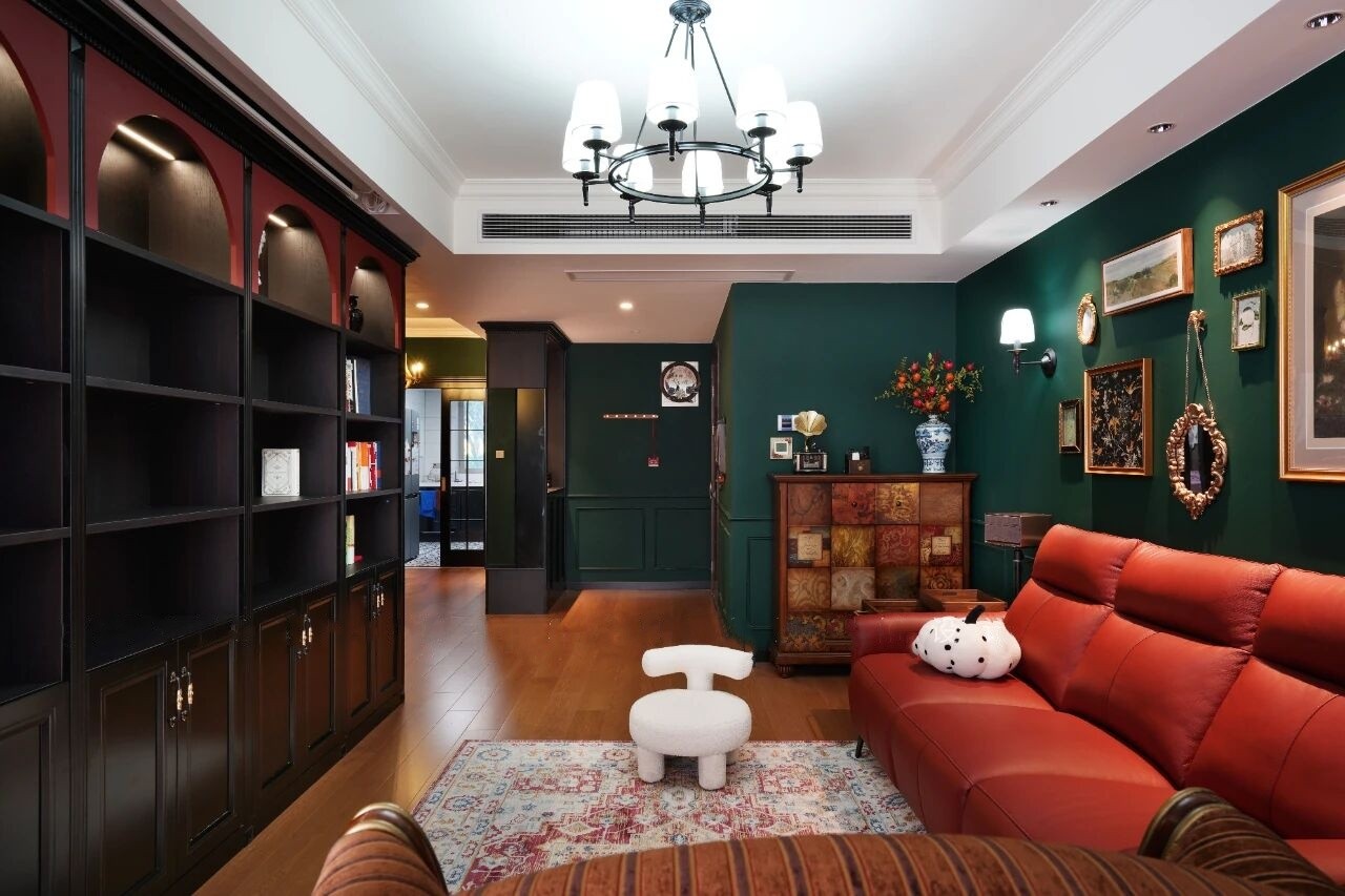 黑红相拼的书柜,线条繁琐的装饰画,复古红色皮质沙发轻松拿捏氛围感,舒服又好打理。