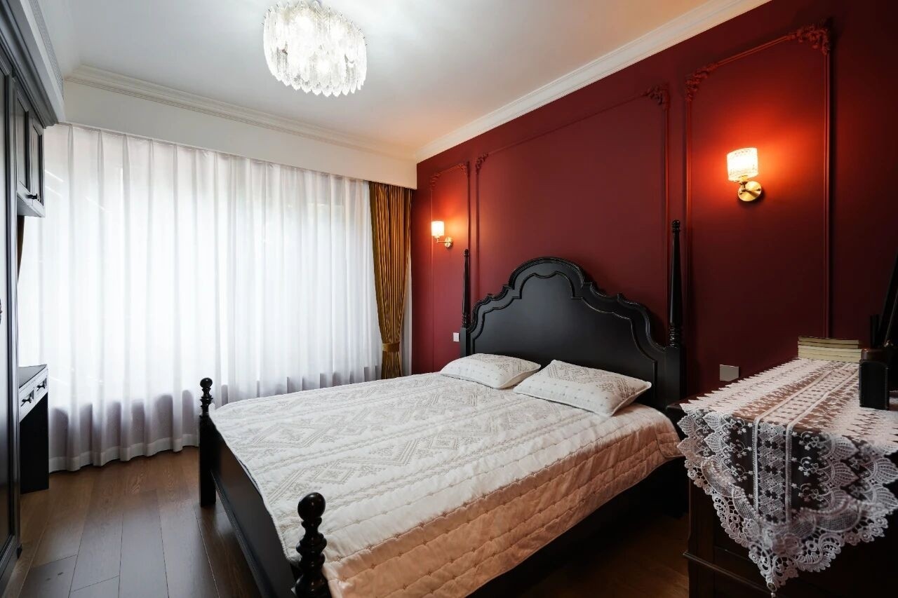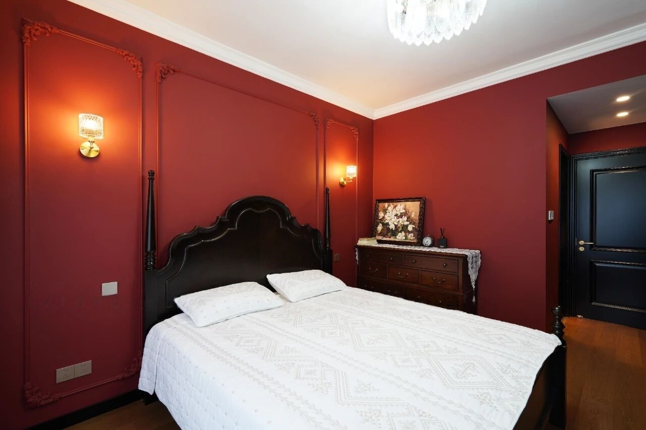 高背床板视觉简单大气,令空间更显宽敞,复古红的床头背景做了简单的石膏线,轻松提升卧室的美观度。