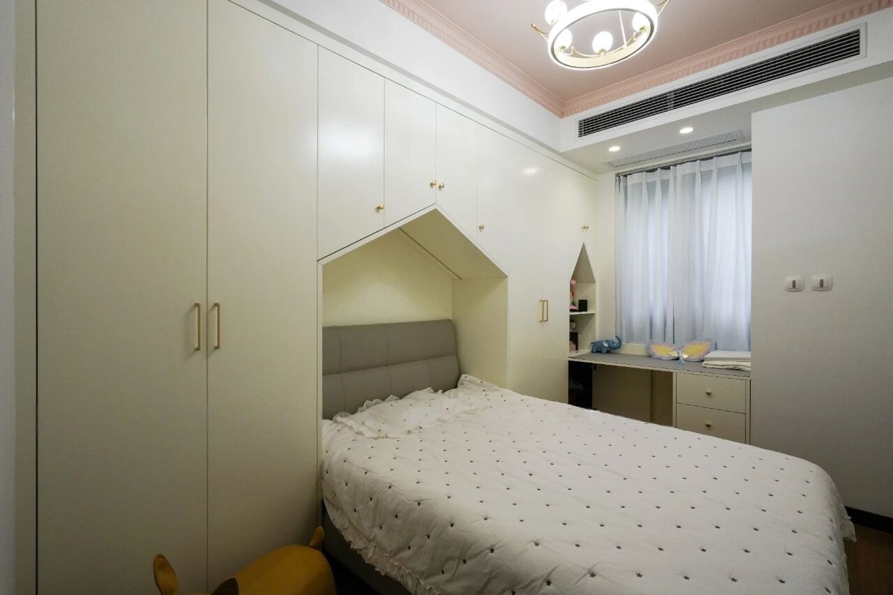 儿童房整体呈现温馨的白色,小木屋造型的定制柜和1.2米的单人床组合搭配,活泼又充满童趣