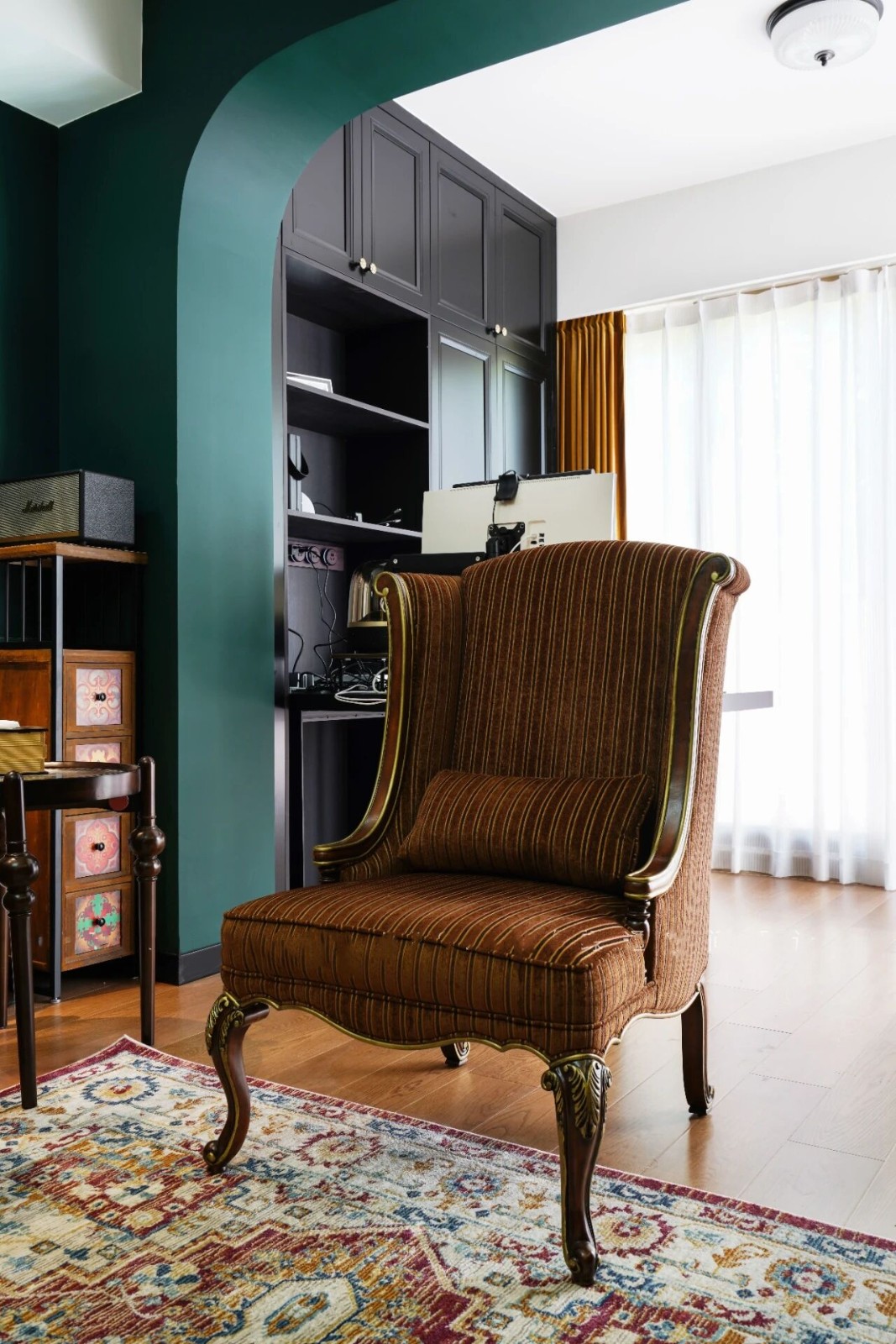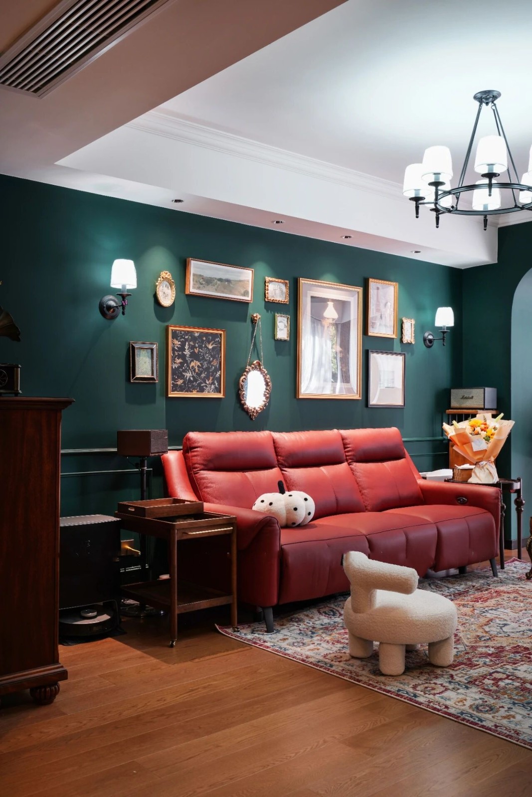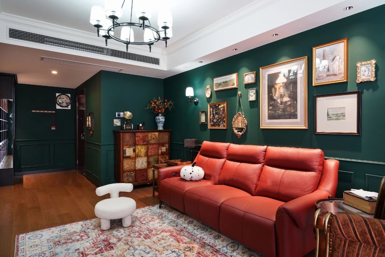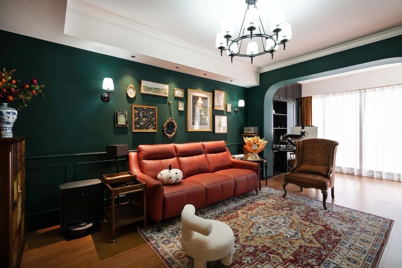 复古红+复古绿碰撞出来的绝美小家,也采用了“拱形门”的设计元素,增加了空间的艺术感。