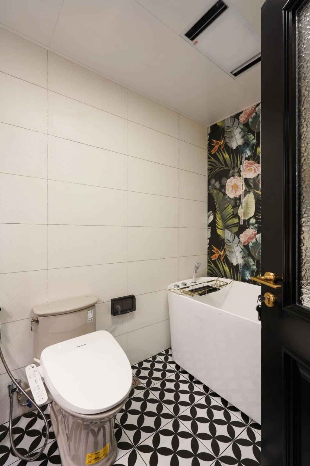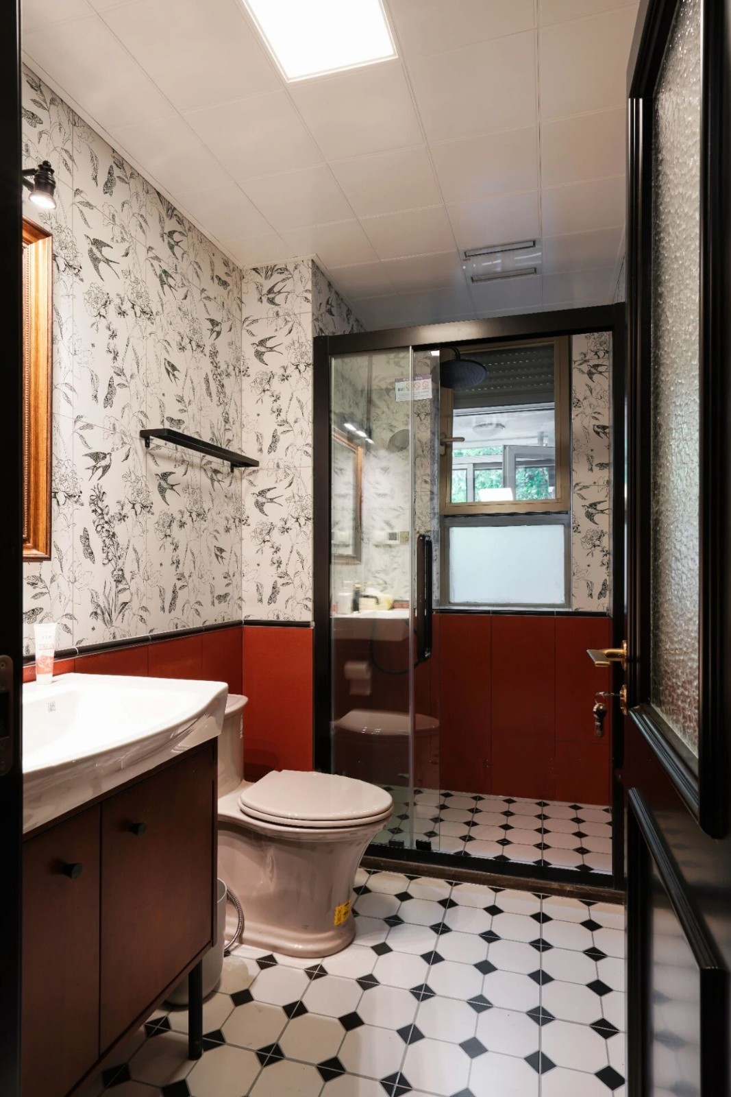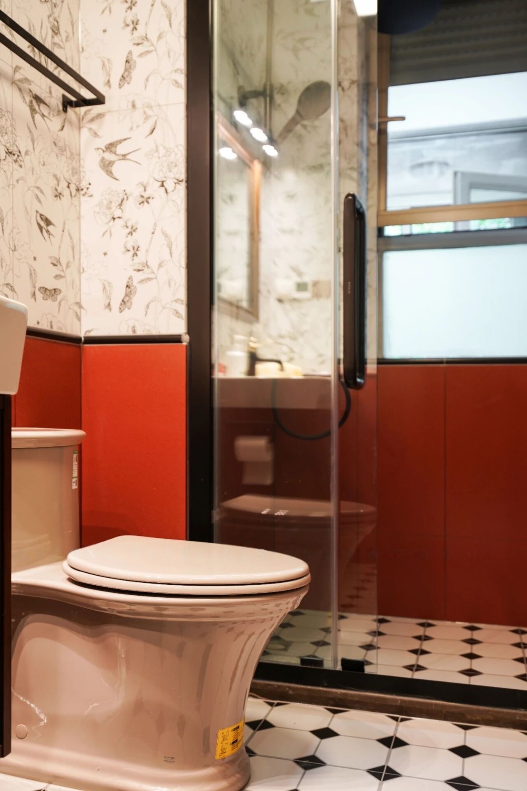 卫生间摩登又复古,墙面是花鸟砖与红色瓷砖拼接而成,镶嵌的腰线层次分明,地面采用的是黑白棋砖,与整个风格十分百搭。