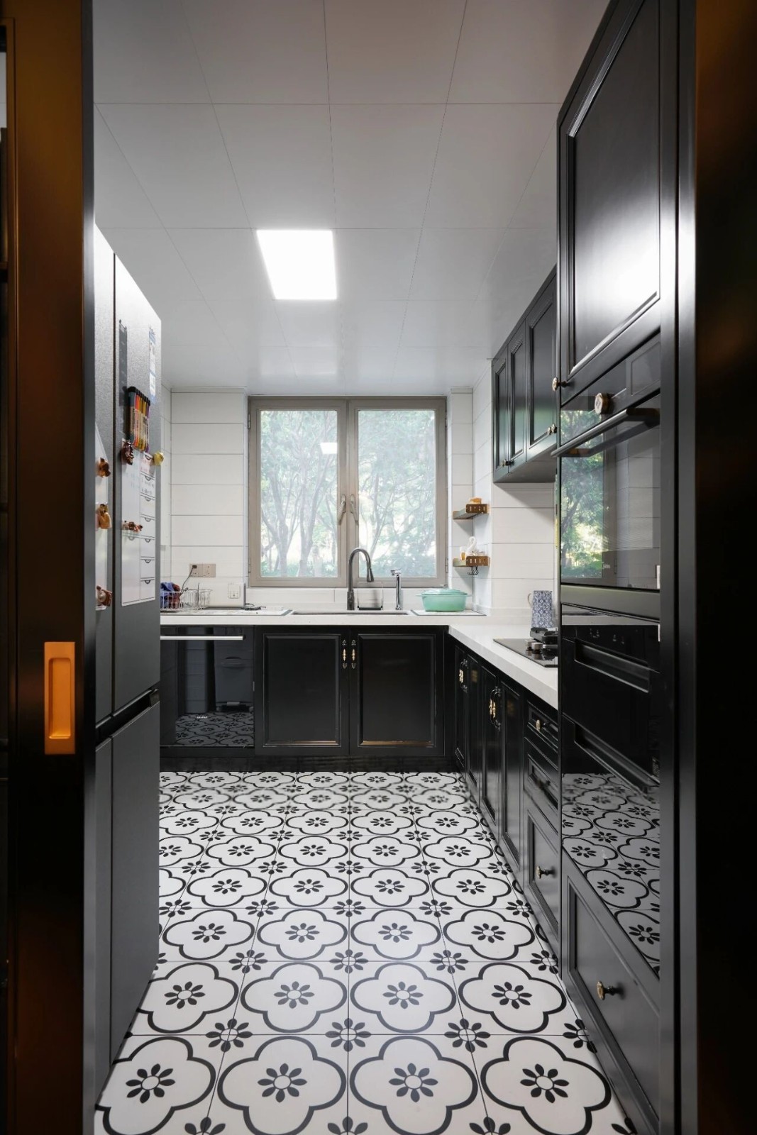 L型厨房布局,在餐厅就能看到黑色橱柜搭配铜质拉手