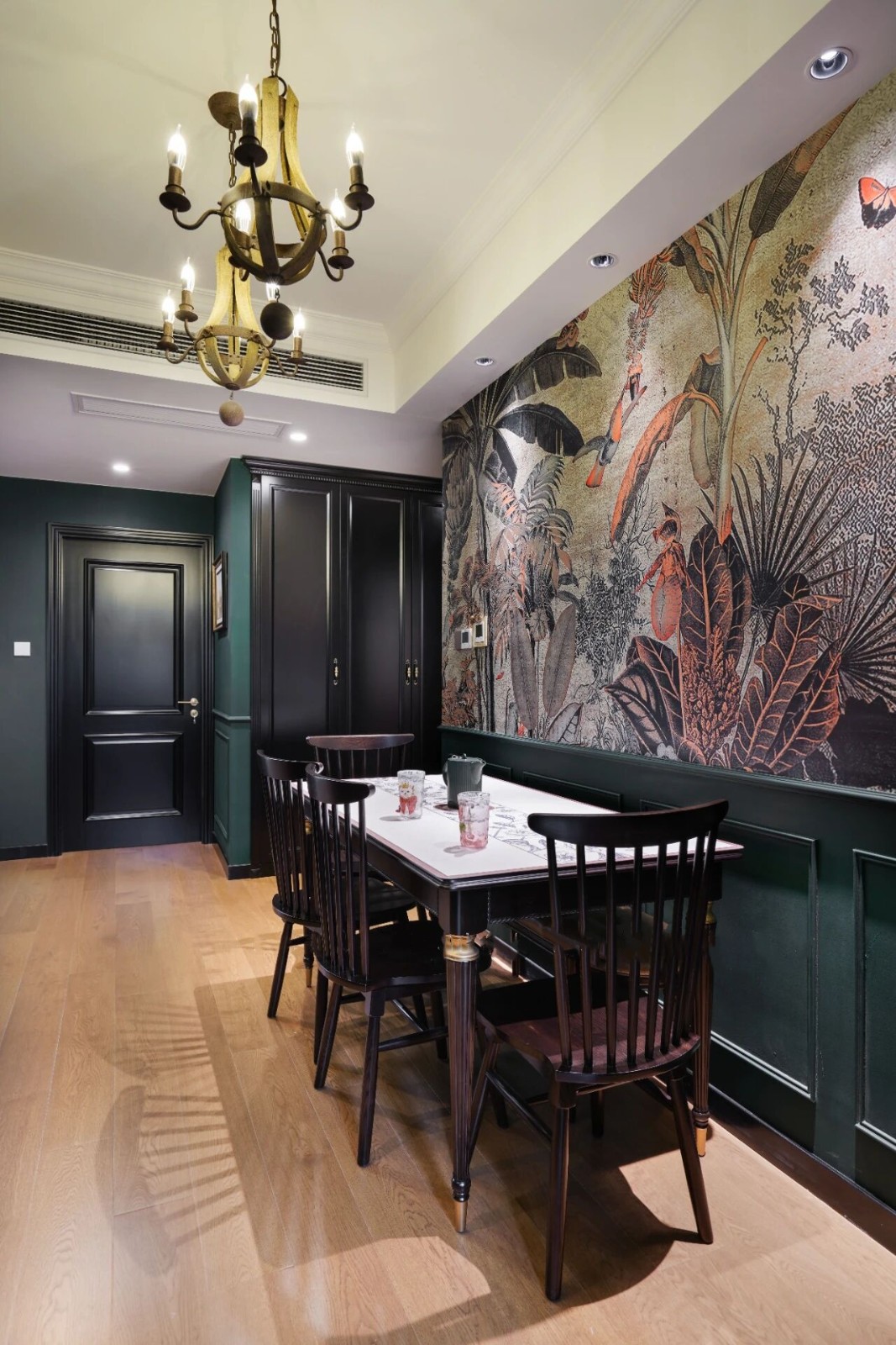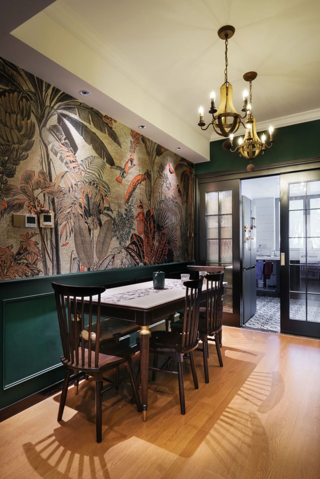 定制的丛林壁画和复古绿完美结合,每一寸都不容错过的美,胡桃木的餐桌椅文艺怀旧,经典大气。