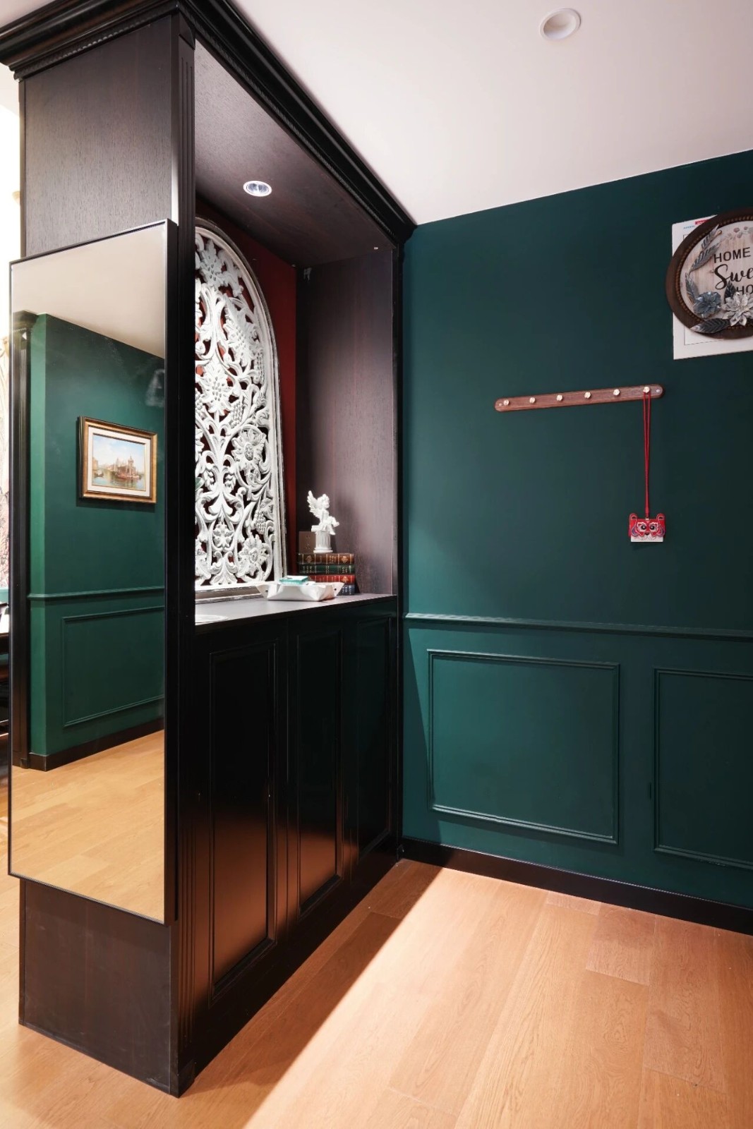 打破常规,入户玄关一幅美式复古的雕花壁挂仿佛给这个叫“家”的故事拉开帷幕,神秘又充满格调,让人想一探究竟。