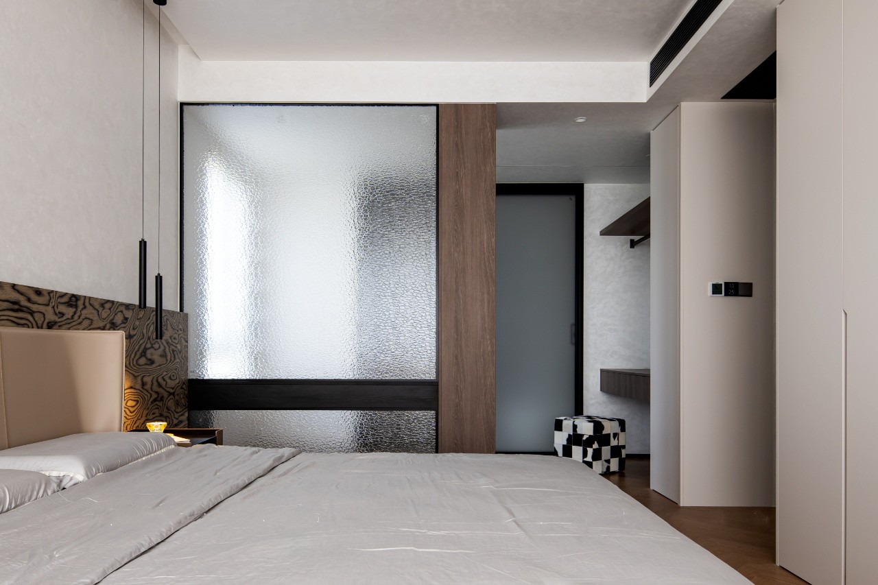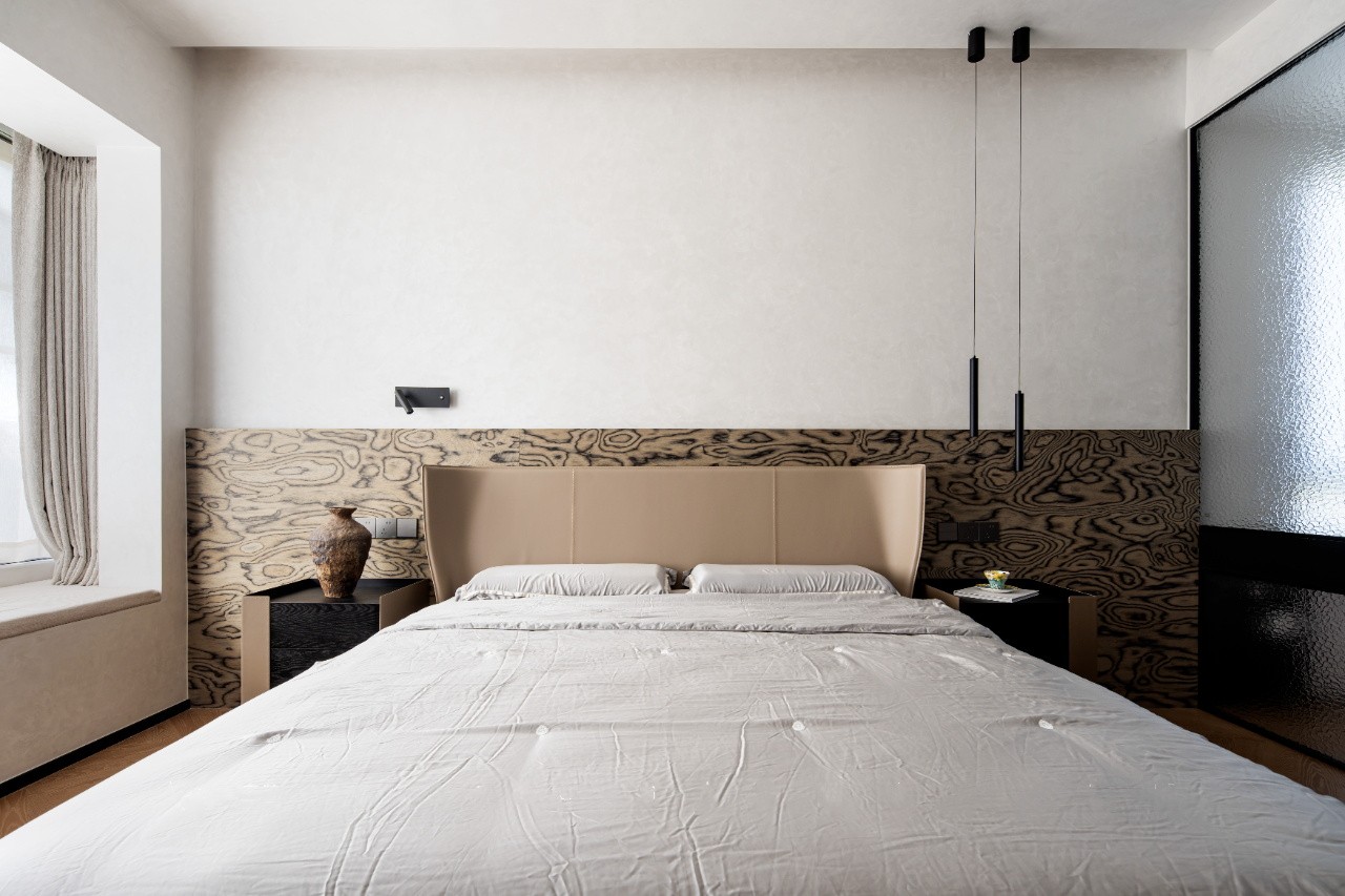 入户区域增设一面墙体,由木与石组合而成,简约的造型极具力量美学。