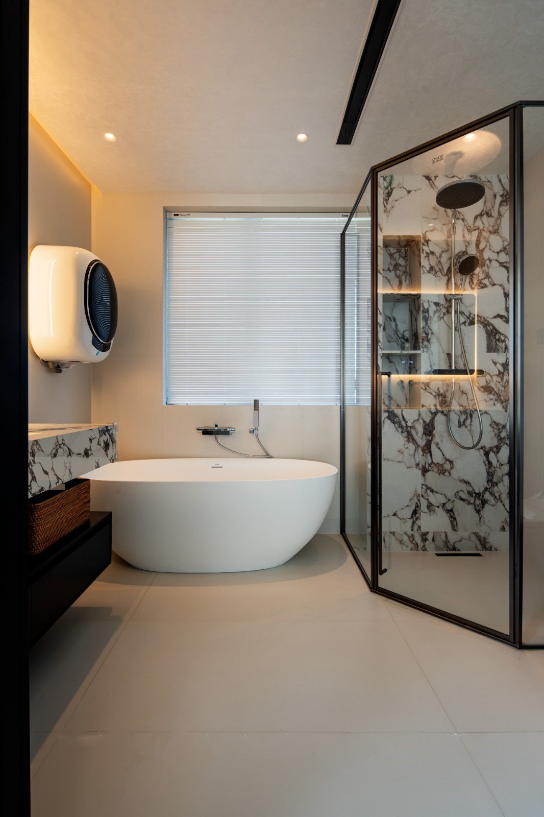 主卫白色瓷砖从地面延续到墙上,与浴缸、洗漱台、座位连成一个整体,且每个边角都呈圆弧形,蜿蜒铺贴在墙上的棕褐色大理石瓷砖,既亮眼又能增强视觉张力,起到了很好地装饰效果。