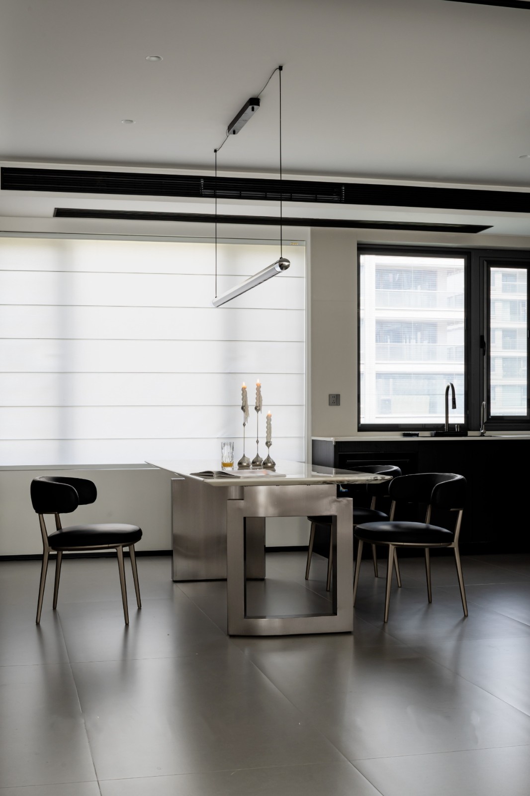餐厅连接客厅,开放式的动线设计,不仅让空间之间的互动加强,也确保了各个功能空间之间得以顺畅流转。