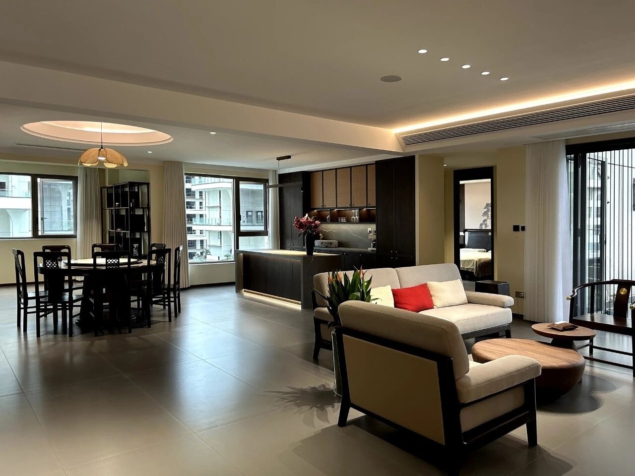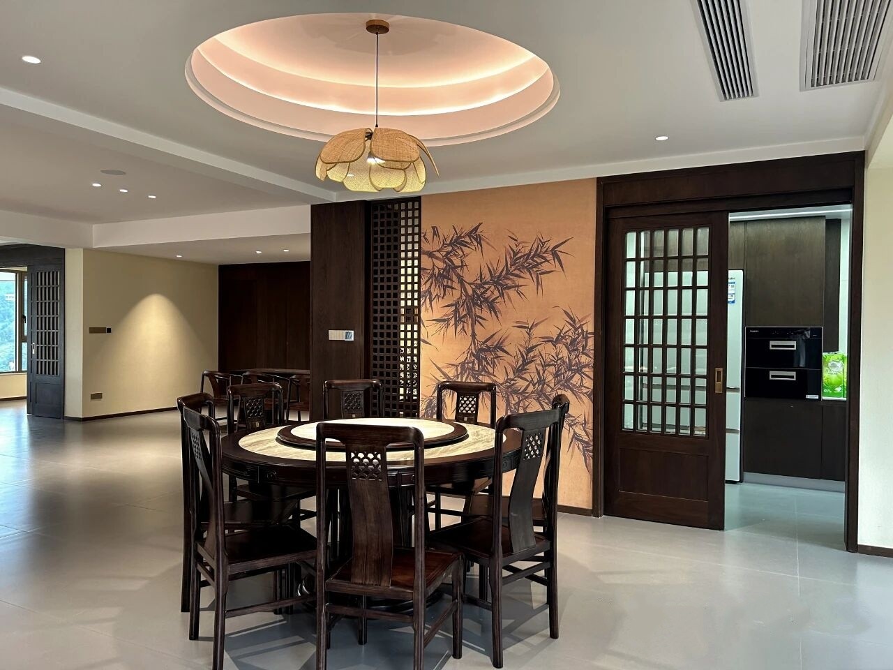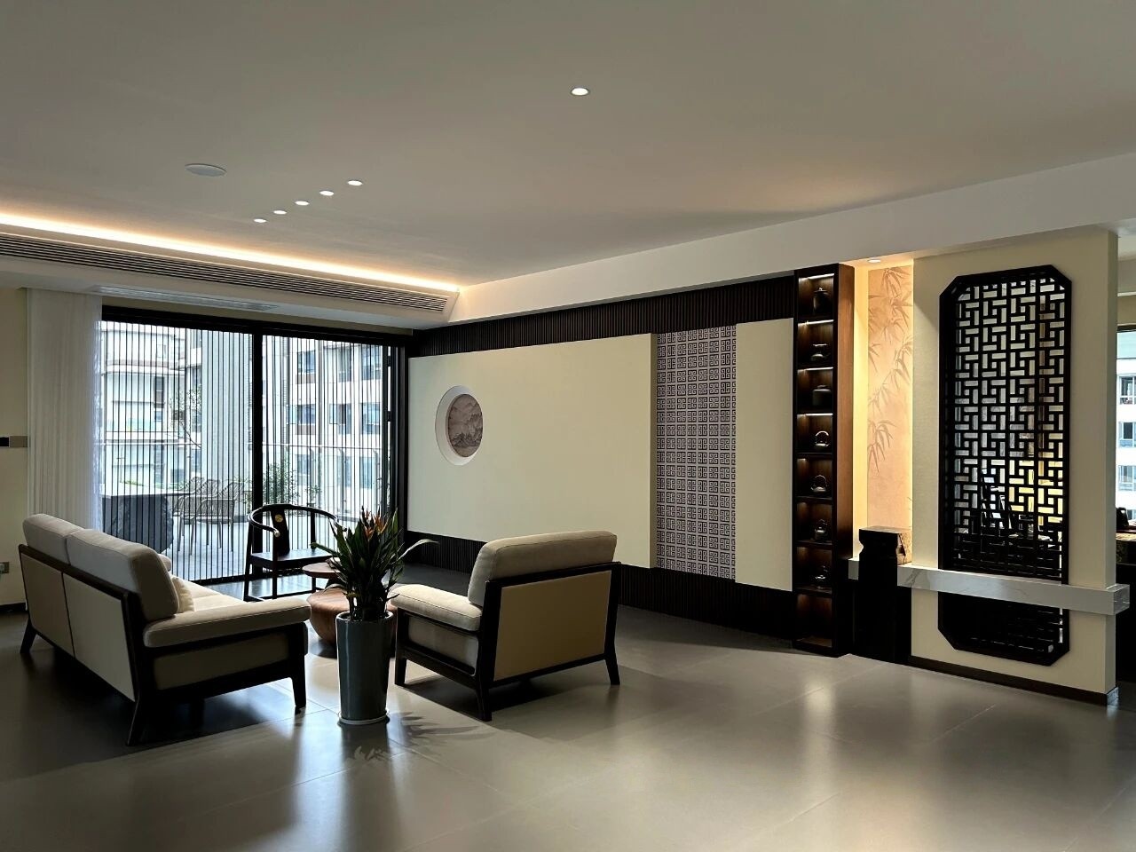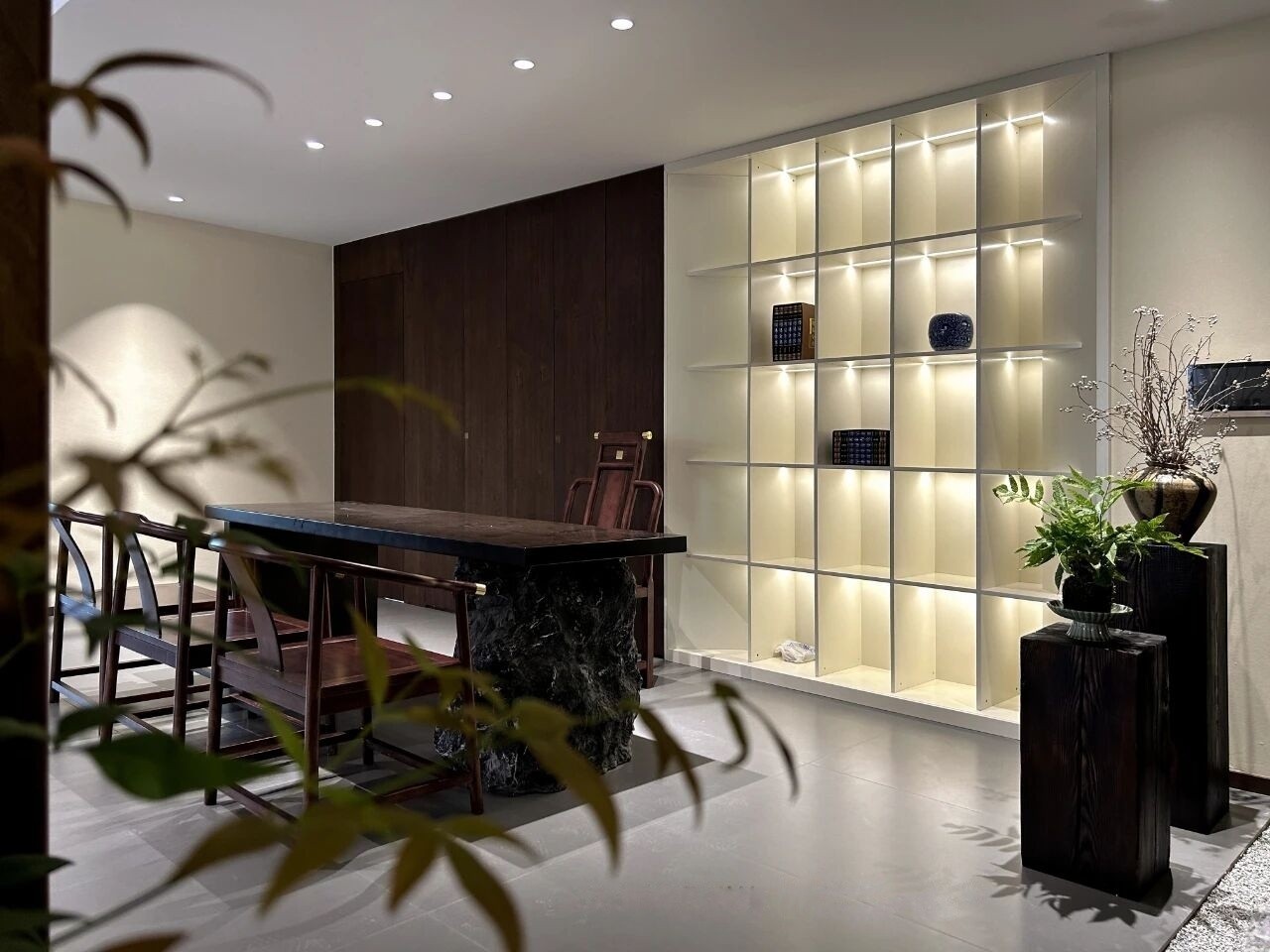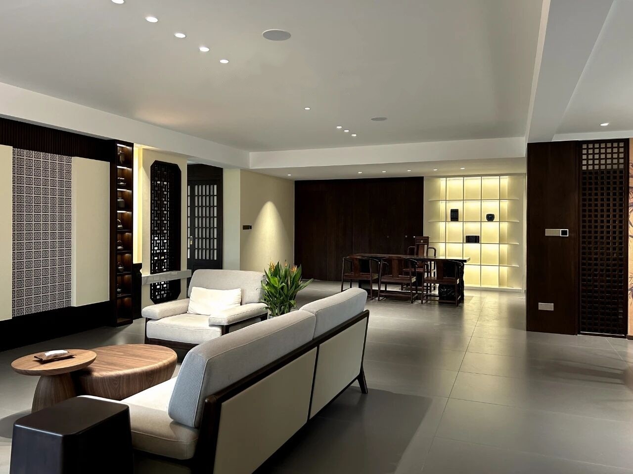 茶台和周围的座椅创造了一个完美的交流区,无论是家人朋友的聚会,还是一个人的静谧时光,都能在这里找到适合的角落。