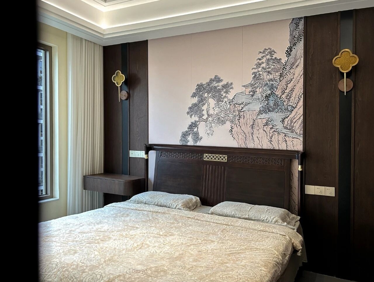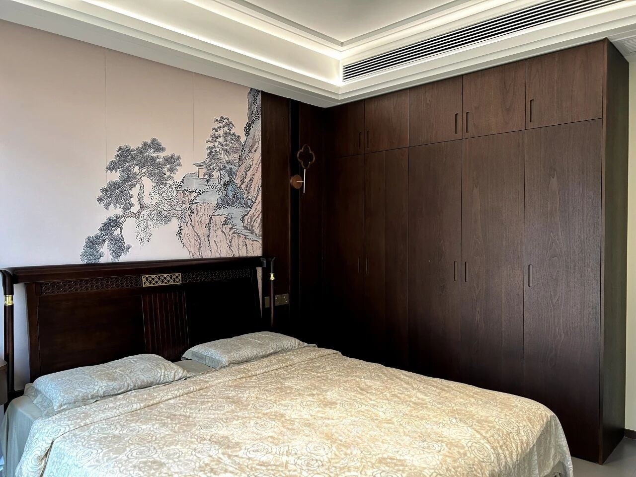 主卧延续客厅格调,设计了国风画+胡桃色木质背景,再搭配床头柜上的插花摆设