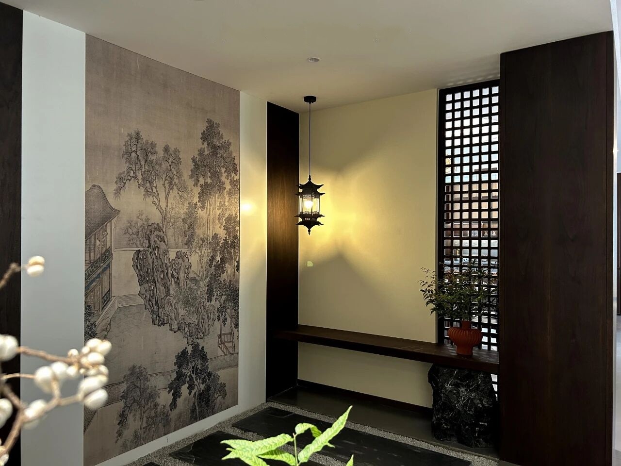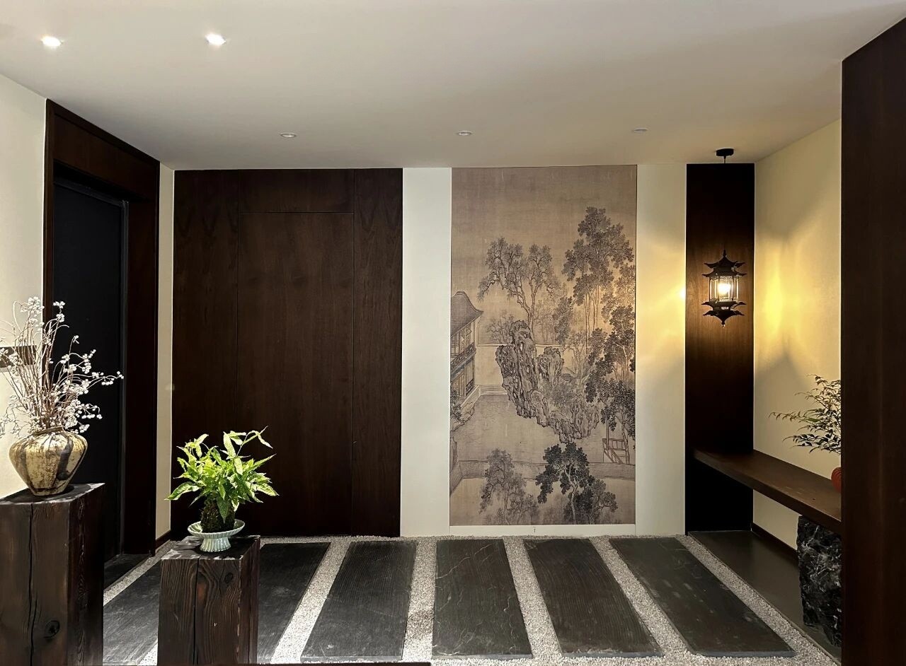 入户尽显宋式美学的雅致与内敛,木质元素+山水画贯穿其中