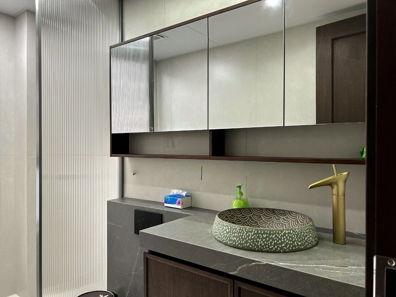卫生间延续了宋韵美学的极简风,木质浴室柜+精心搭配的优雅洗手池相得益彰,让整个空间都散发出宁静优雅的气息。做了干湿分离,通高的玻璃隔断,解决了湿气和气味等问题。