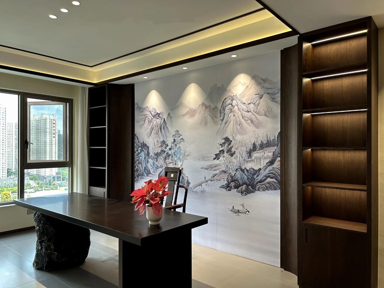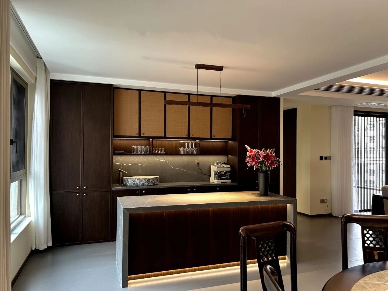 深胡桃的柜体纹理自然,搭配温润的米色墙画,营造出宁静的氛围。