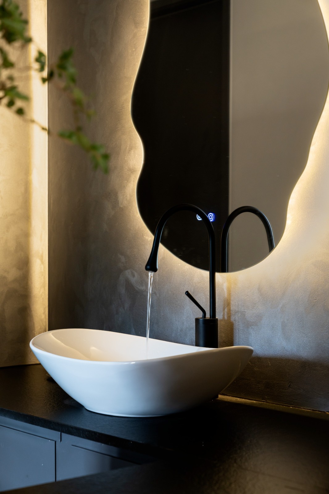 卫生间以做旧质感的灰色墙地面砖,营造出一种独特简约的时尚感。香槟色的灯光、灰油砂的玻璃以及沿用起居室的黑色线条设计,搭配黑色台面,即使是卫浴部分,也透露出极简的品质。