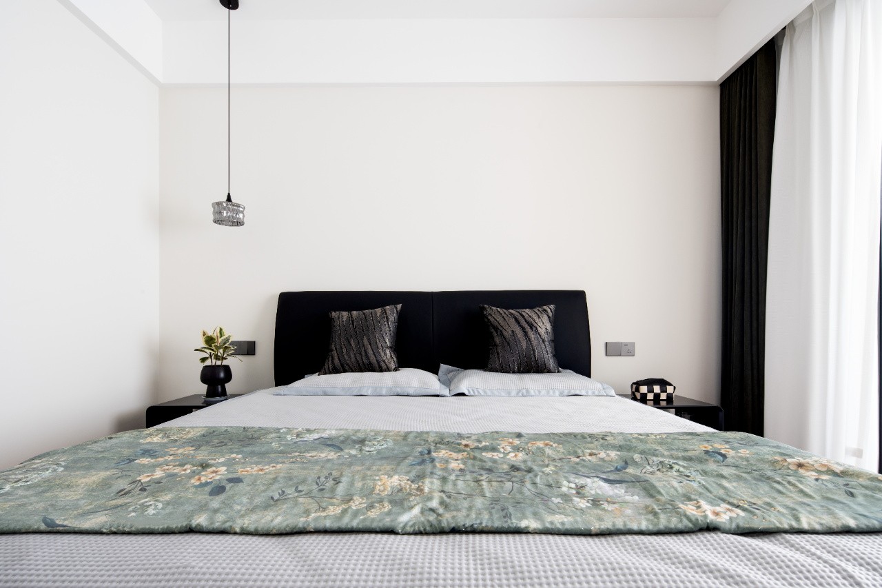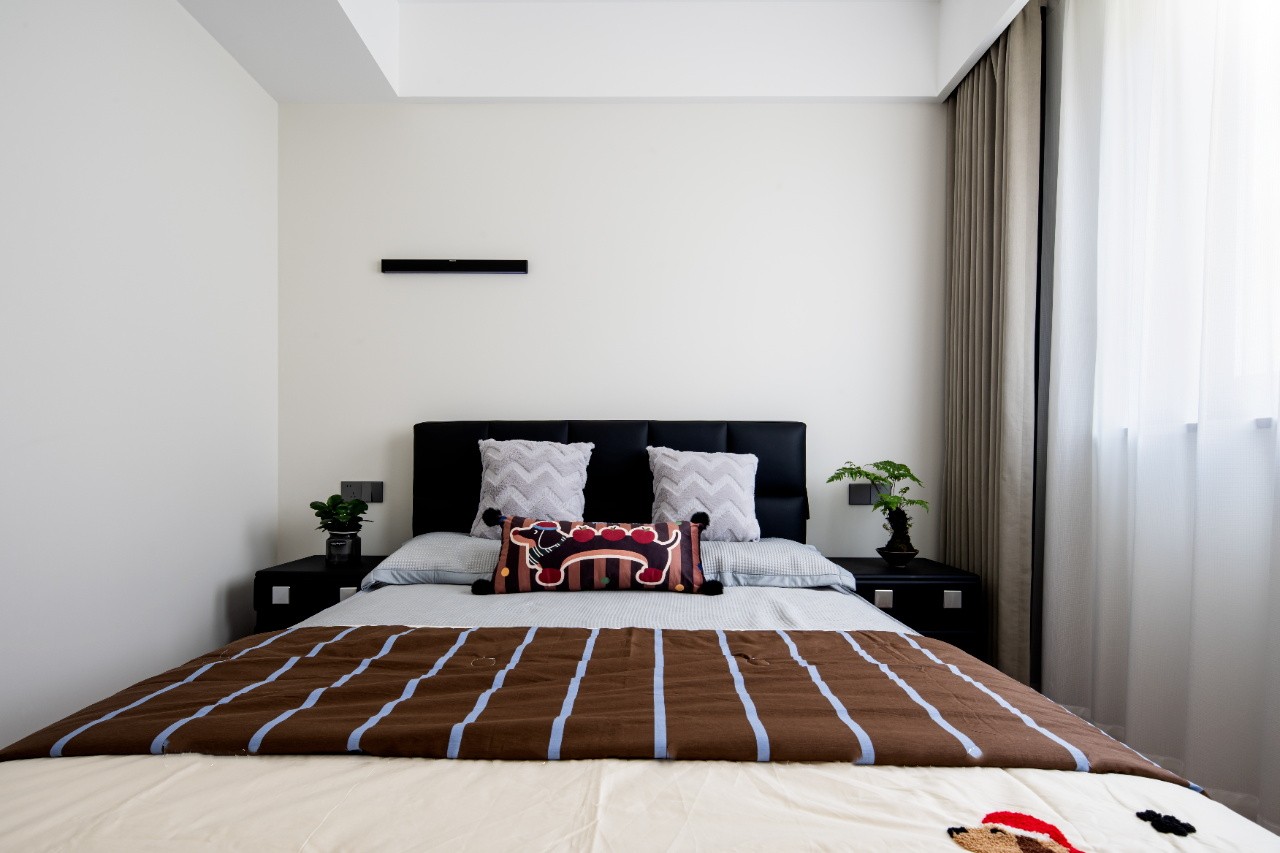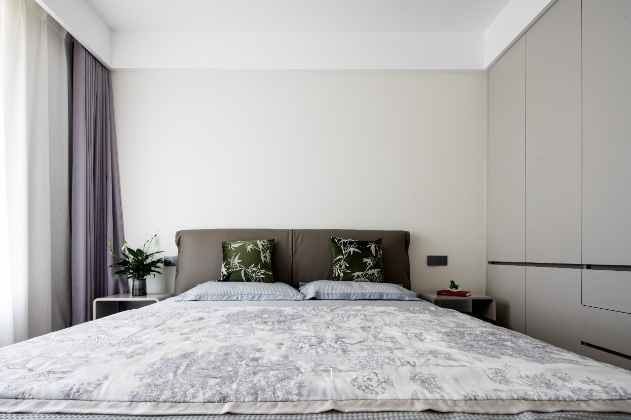 次卧的整体基调依然简约有致,雅致的配色氤氲出富有质感的韵味。光影摇曳中,舒压氛围悄然形成。