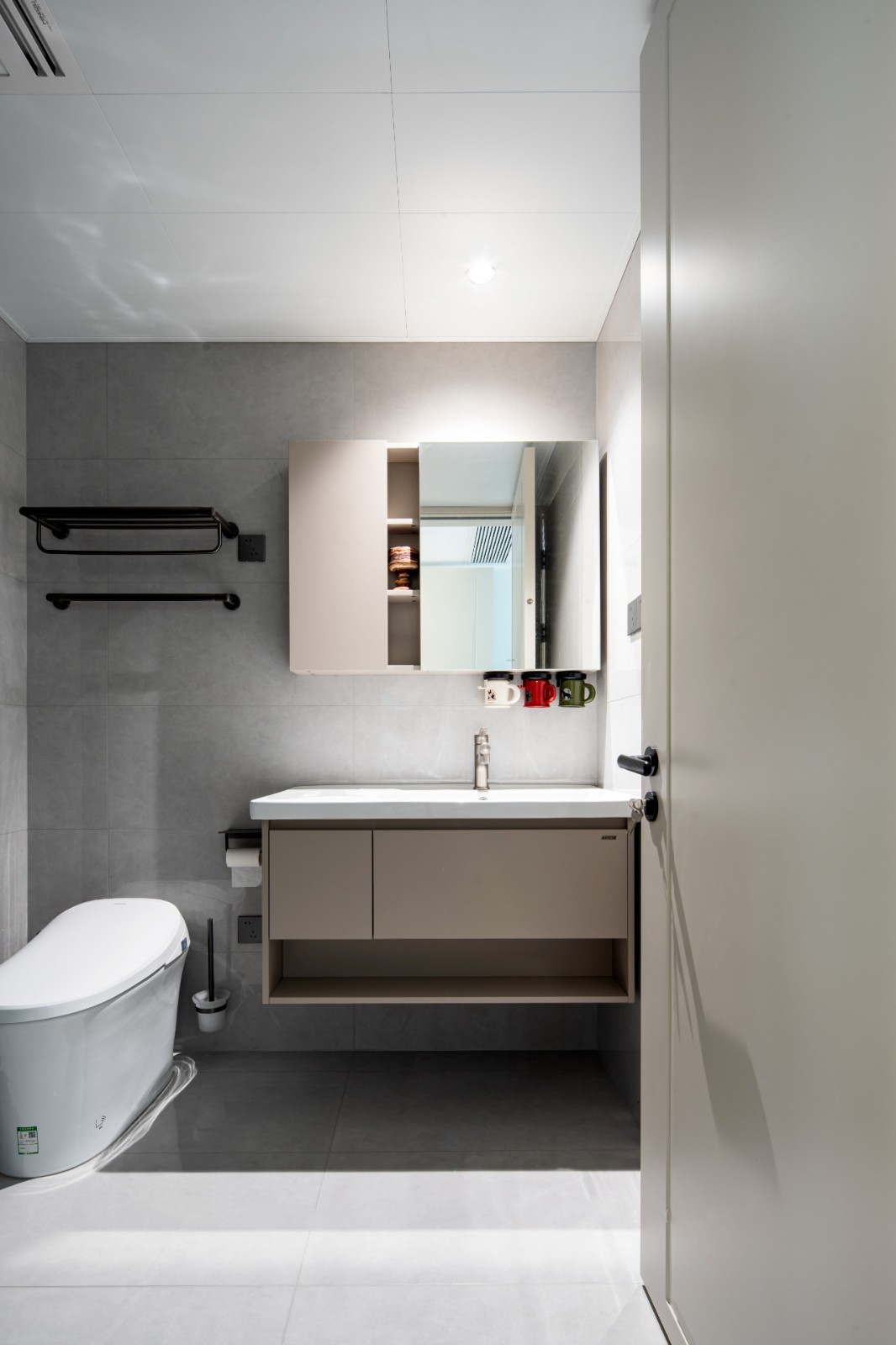 业主希望整体风格以极简为主基调,以及搭配上同色系柜体让整体空间有别于传统的极简风格,使得空间基调增加一丝温暖。