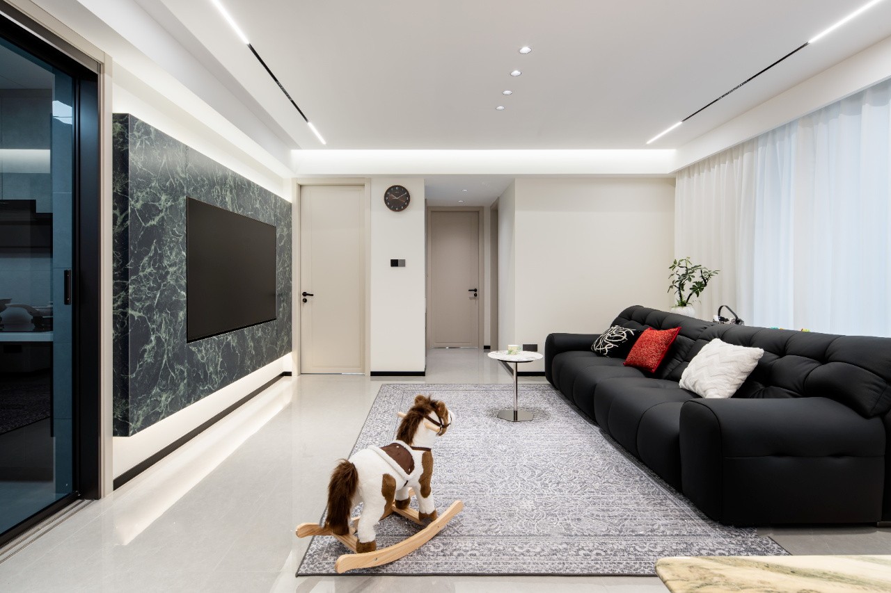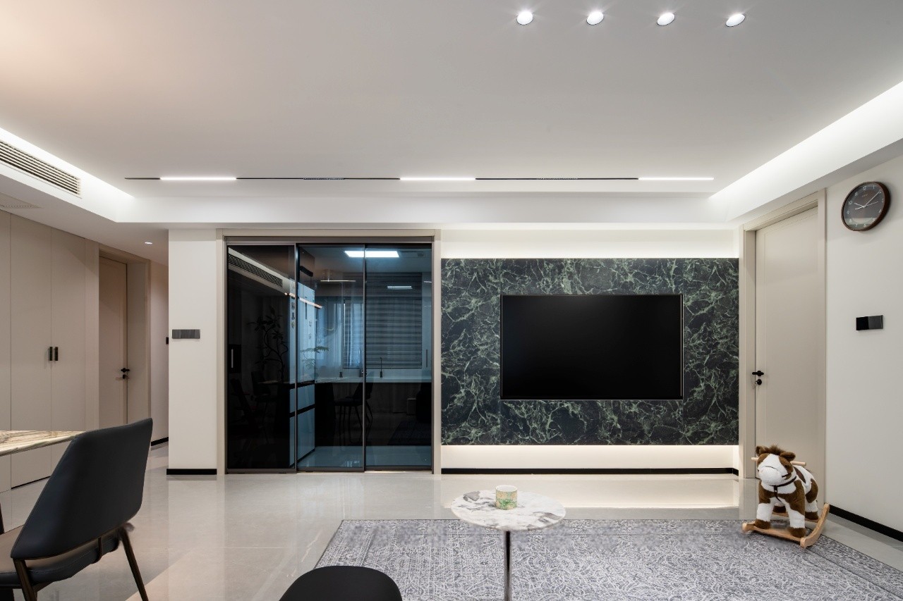 电视背景墙采用大理石打底,翡翠绿自带优雅复古的气质,赋予简约的空间别具一格的气场。
