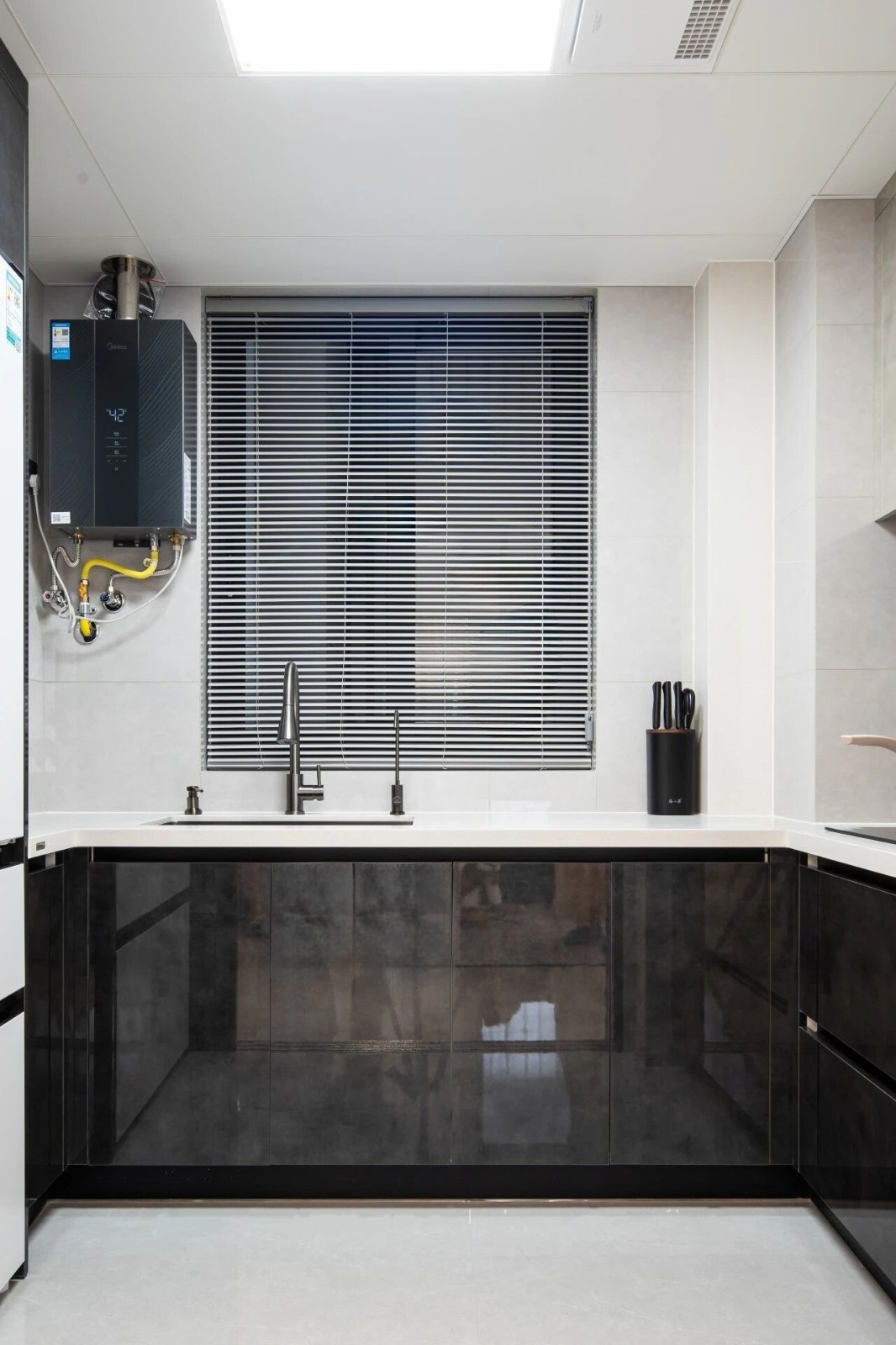 厨房整体也是带给人时尚、潮酷的感觉:黑白灰搭配的厨房,极简又***:顶面不用铝扣板,防水石膏吊顶嵌入射灯;吊柜细边收口,隐形拉手设计,空间整体感极好。地面与墙面,通铺浅灰色哑光瓷砖,营造整洁的备餐环境。