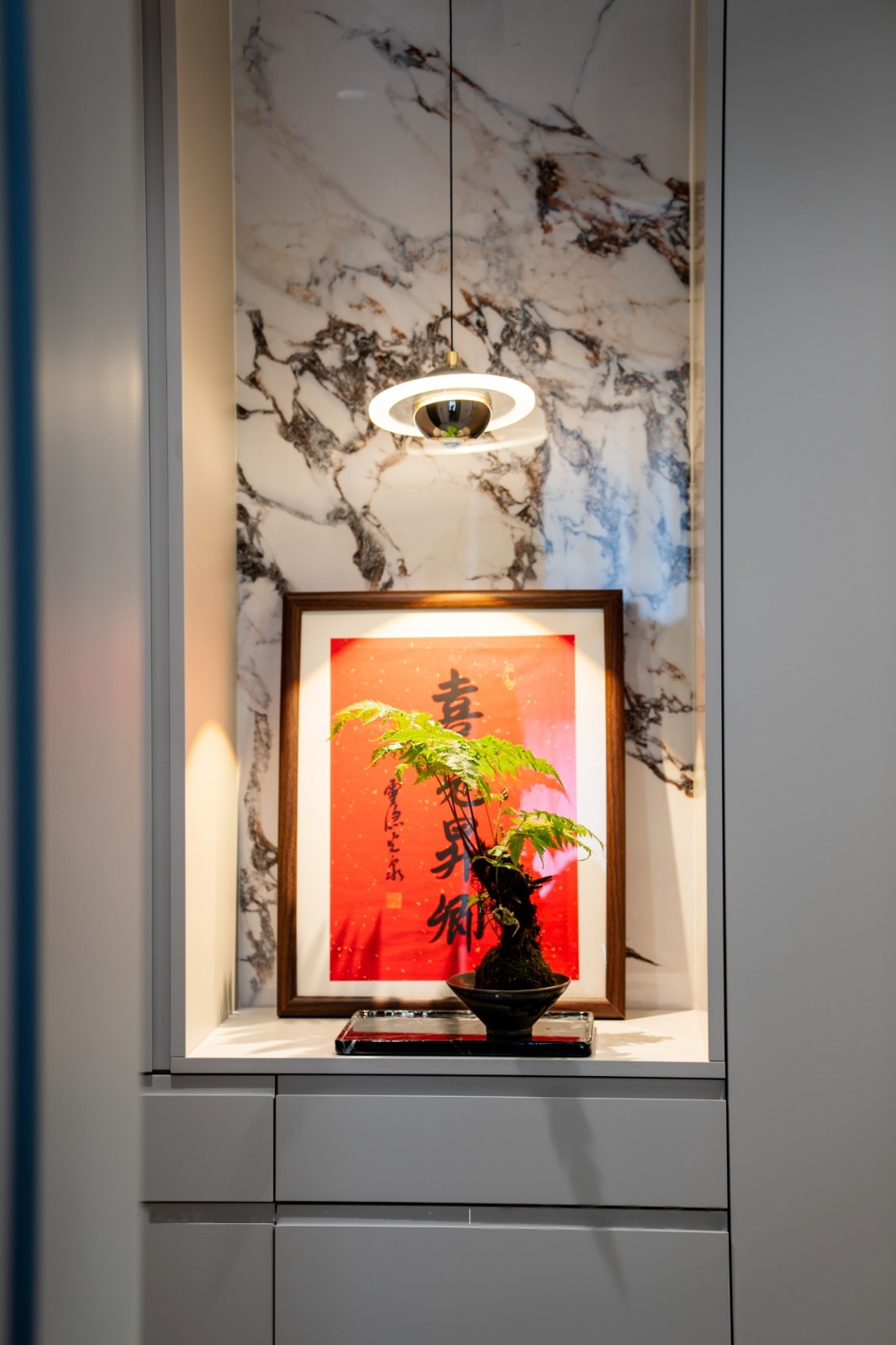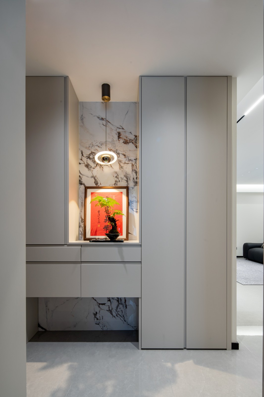 入户的收纳空间主要用来放置业主进出门的鞋子,底部悬空的设计便于放置常穿的鞋子,大理石的背景,更添艺术感! 对于空间本身,我们一直有不同的见解与探索, 像是一个开放性的题目, 答案远不止一种。