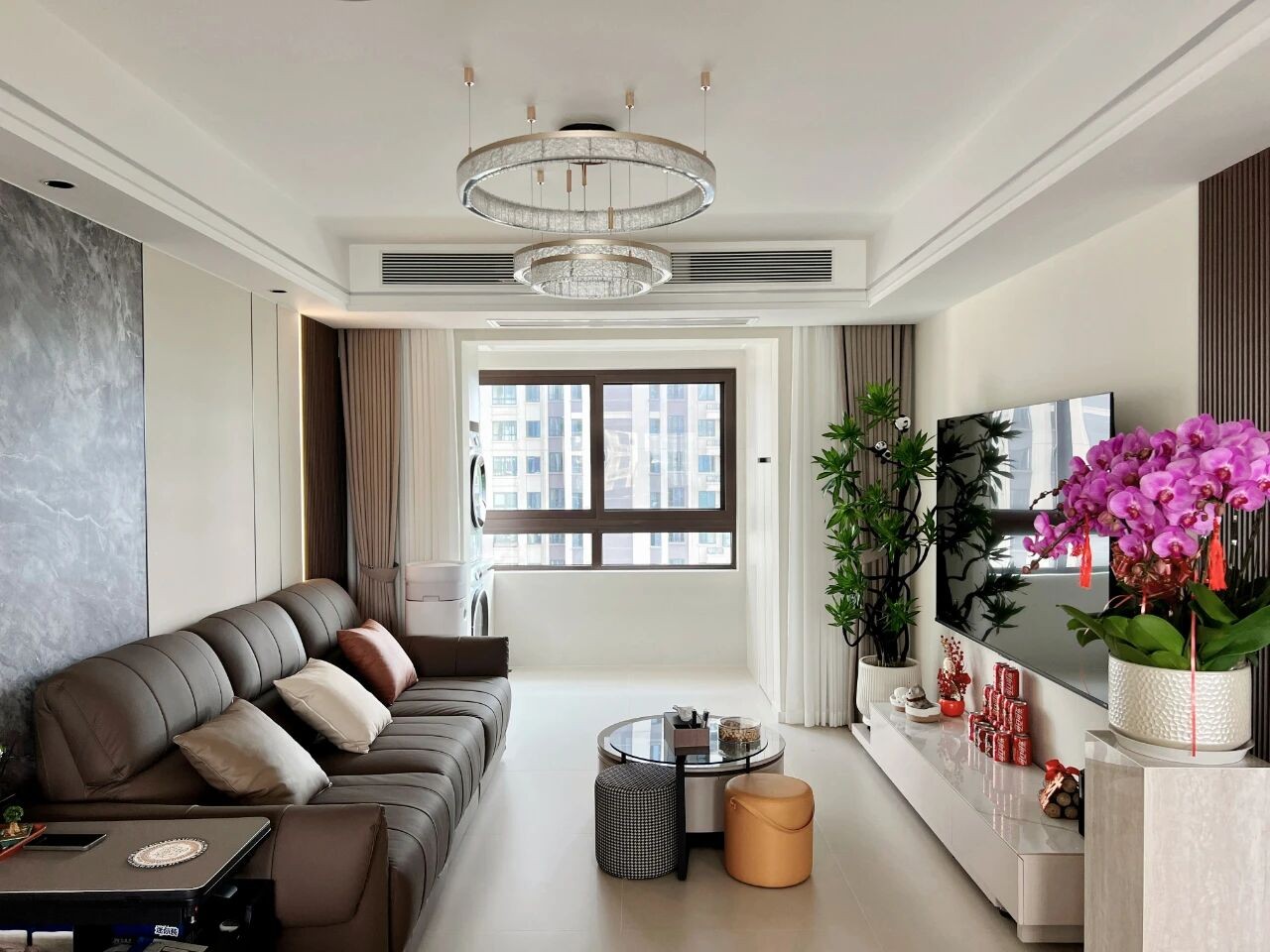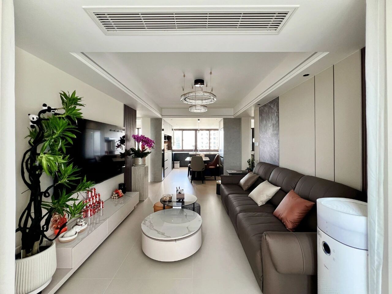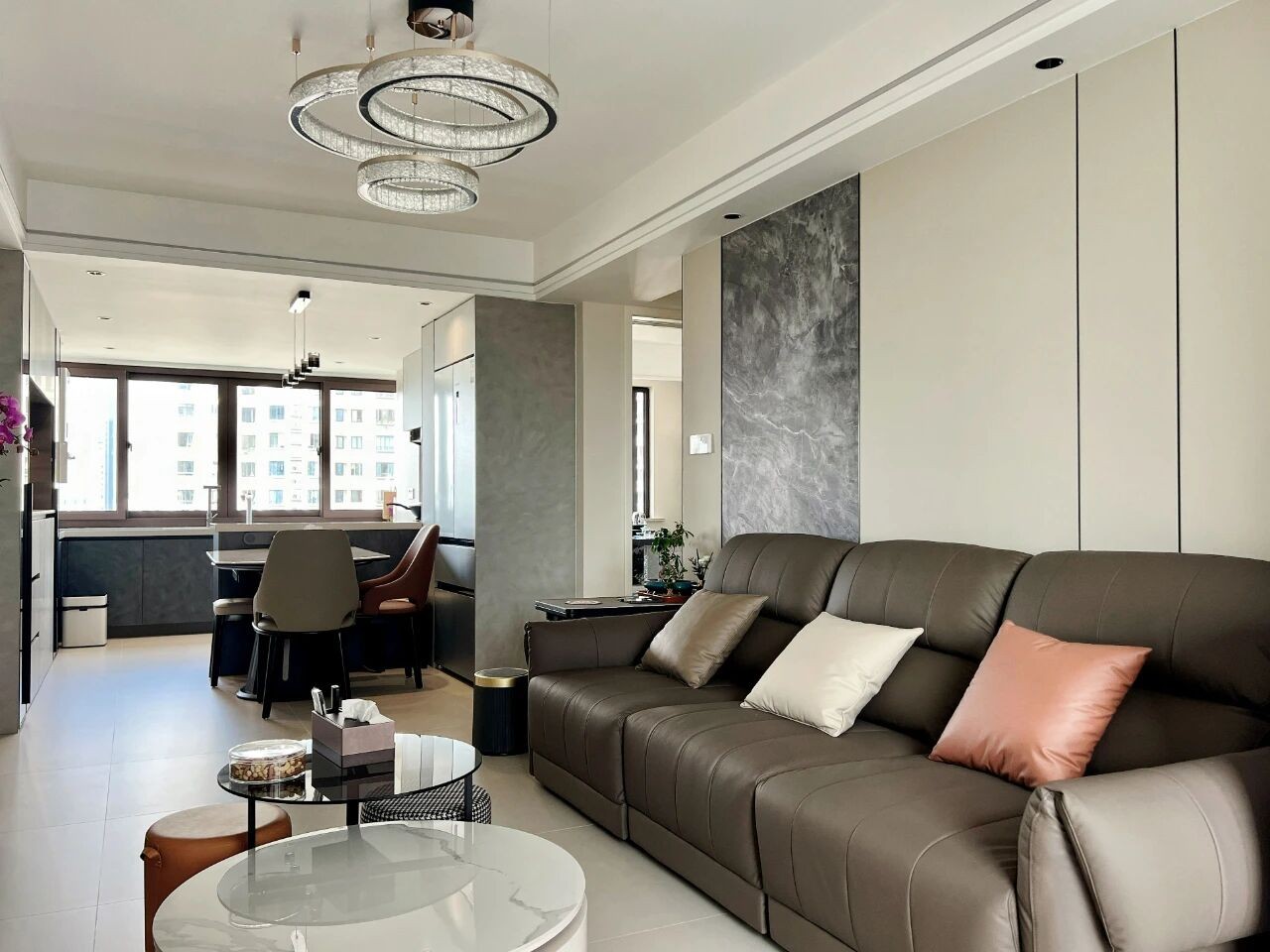 空间布局上,客、餐、厨呈一字型序列,构筑出开放空间的主轴。设计以“生活的舞台”为灵感,将三大功能视作连贯的场景演绎。