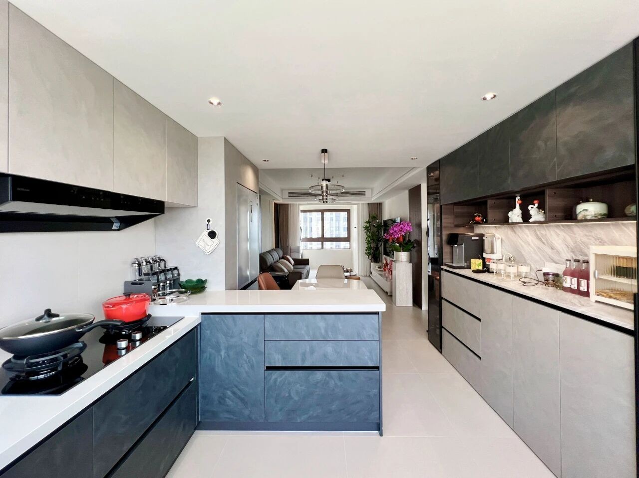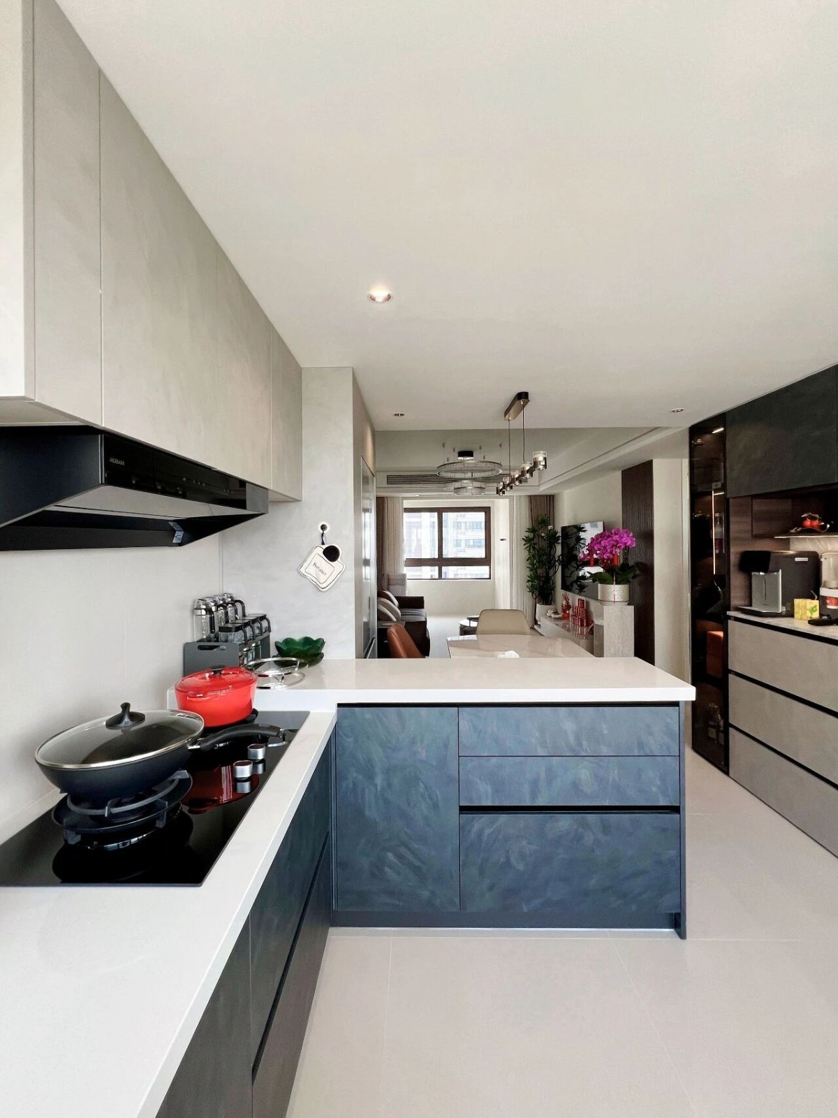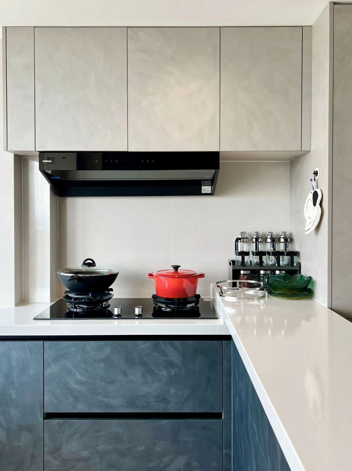 色彩策略上,我们采用“深空灰-白-浅灰”的纵向渐变:下柜的深色赋予空间沉稳的锚点,白色台面干净且易于打理,浅灰上柜则有效提升视觉纵深感,避免压抑。