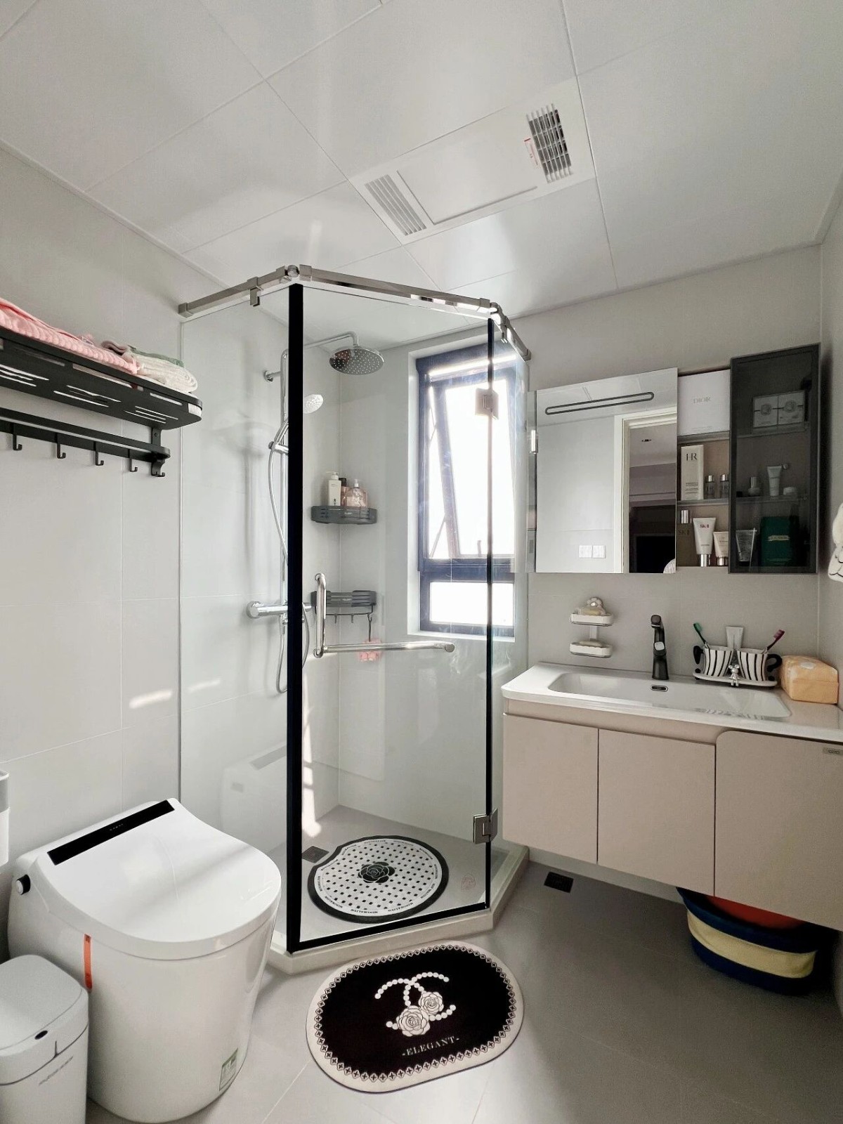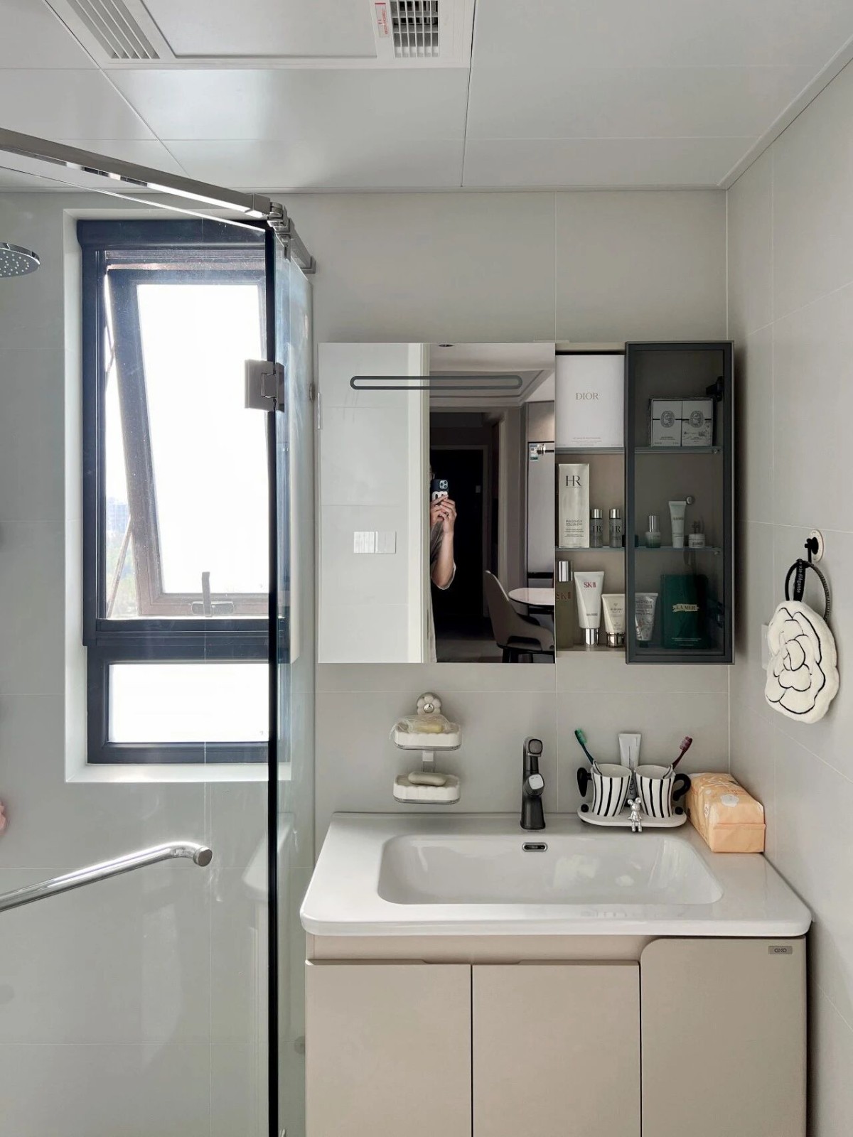 卫生间打造了一个高效且体贴的L型功能环。我们严格遵循干湿分离原则,并将淋浴区置于马桶区与洗手台之间,形成流畅的三角动线。