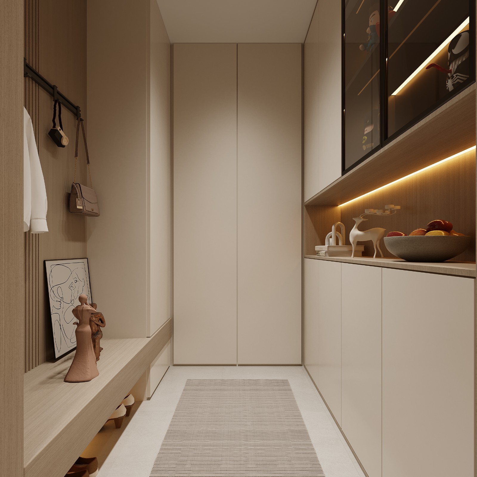 以奶油风为核心,浅木色柜体搭配悬浮式换鞋凳,呈现简洁实用质感。开放格陈列艺术摆件、日常小物,底部灯带照亮鞋区,挂钩、挂画增添生活温度,整体借自然材质与柔和光线,打造功能齐全、格调统一的入户过渡区 。