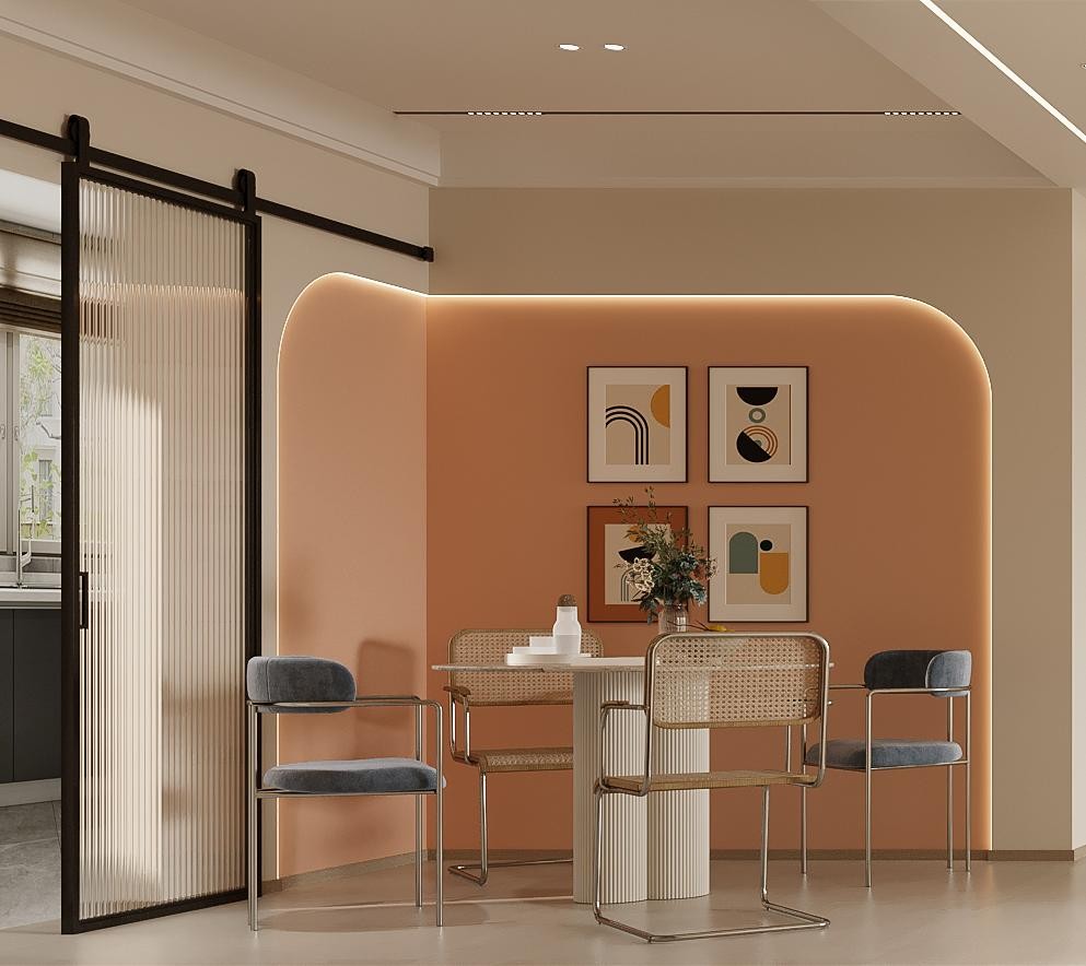 走奶油风温馨路线,浅橙弧形墙面搭配艺术挂画,呈现浪漫用餐氛围。圆形餐桌搭配藤编、布艺撞色餐椅,传递自然温度。玻璃移门实现空间通透,让烹饪、用餐互动便捷,整体借柔和色调与独特造型,打造实用与美学兼具的家庭聚餐区;