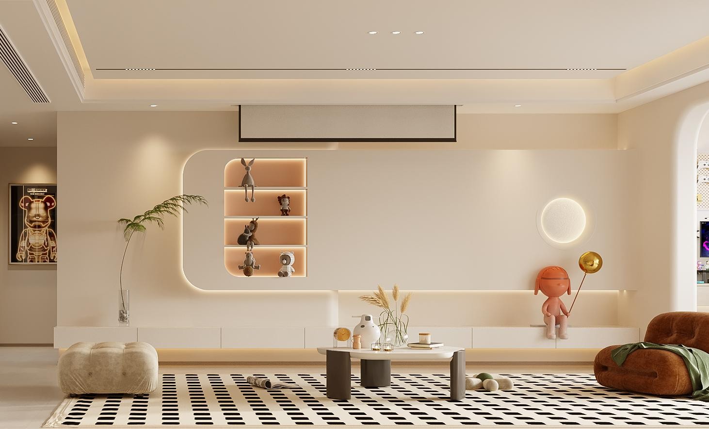 以奶油风为基底,浅米色墙面搭配弧形线条与内嵌展示架,呈现温馨艺术氛围。展示架陈列潮玩,搭配绿植、艺术摆件,传递生活趣味。悬浮式电视柜简洁,底部灯带增添层次,棕色单人椅、圆形小几与黑白几何地毯组合,构建舒适且具设计感的休闲互动场地。