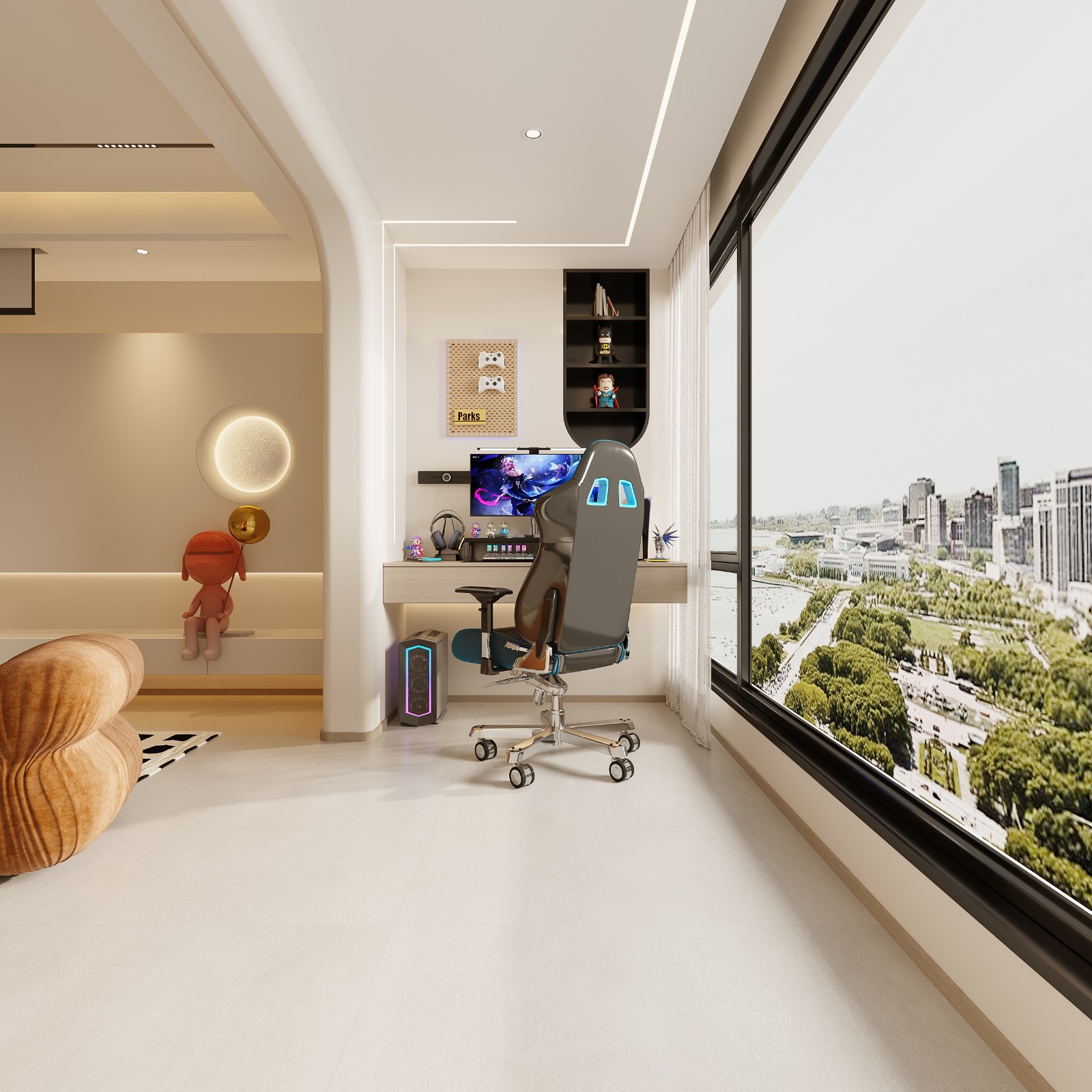 针对年轻业主兴趣设计,奶油风基底融入科技感。悬浮式书桌、专业电竞椅与炫酷主机,满足电竞需求,墙面装饰画、潮玩陈列展现个性。大面落地窗引入城市景观,让空间明亮且具视野,构建集工作、娱乐、观景于一体的功能场地。