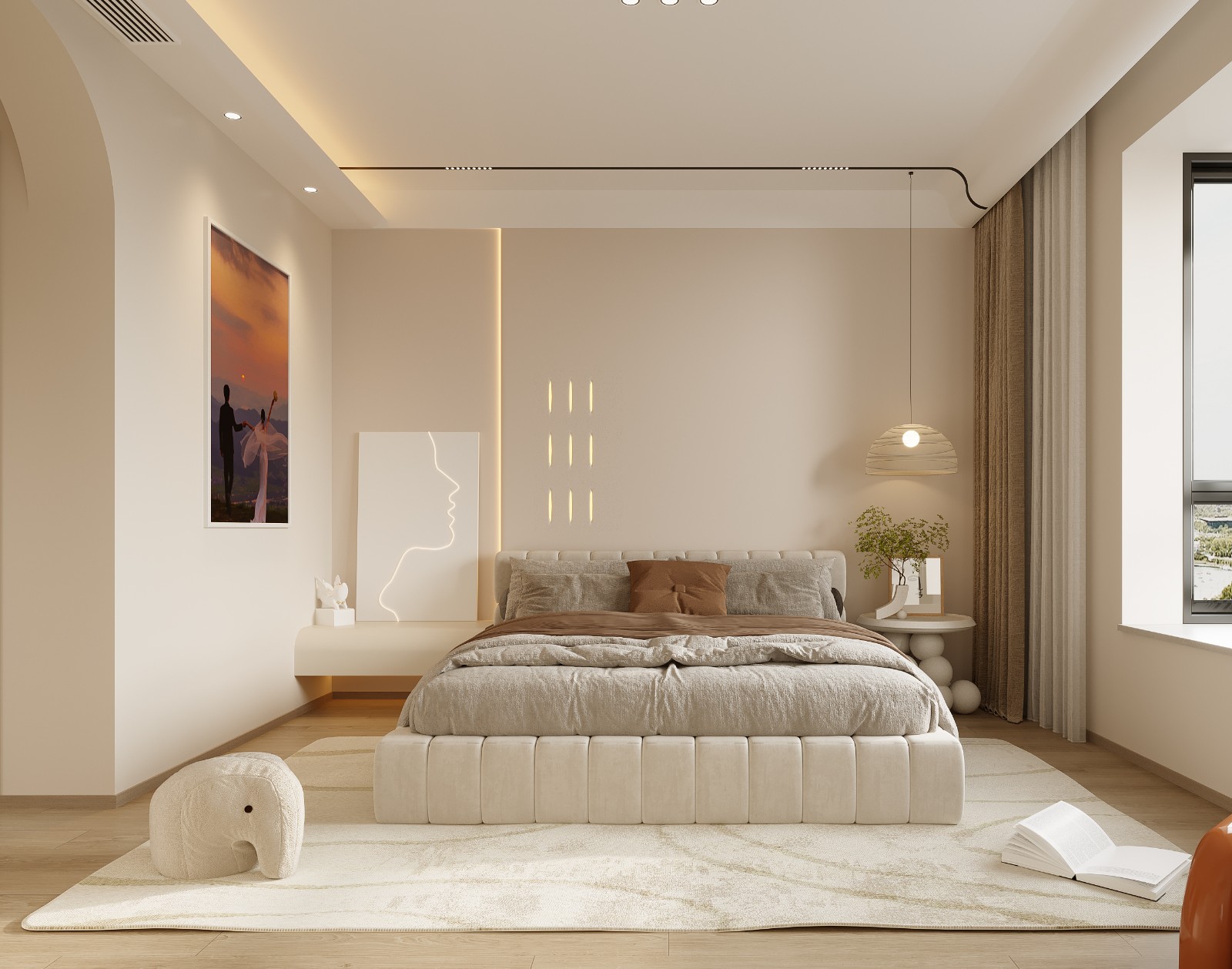 呈现奶油风静谧格调,浅米色墙面搭配弧形线条,营造柔和睡眠氛围。奶油色软包床具、浅棕床品传递温馨,艺术挂画、创意灯饰提升层次,悬浮式小边几、地毯与玩偶,增添生活趣味。