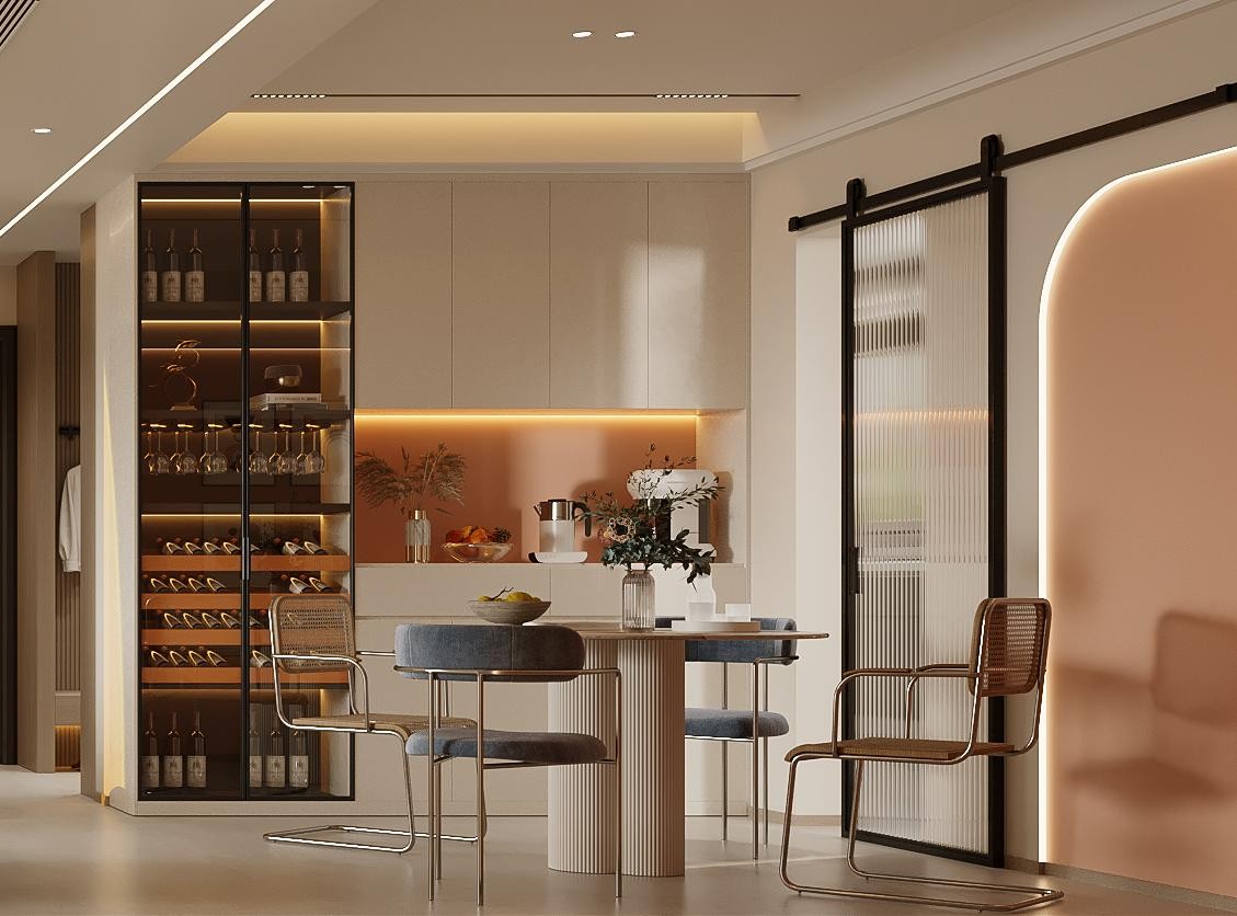 延续奶油风质感,浅米色柜体搭配玻璃酒柜,呈现精致用餐氛围。圆形餐桌、撞色餐椅与艺术花艺,传递生活仪式感。玻璃移门衔接客厅,让空间互动流畅,底部灯带勾勒层次,构建兼具收纳、展示与用餐功能