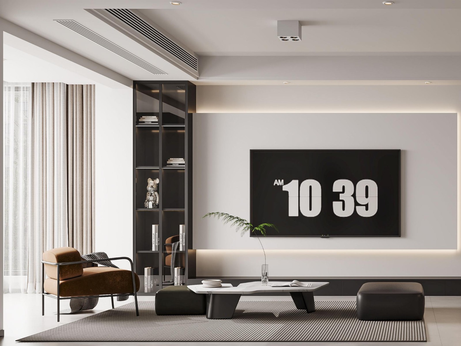 现代风格,以浅白与黑色为主色调,设计简洁利落。电视墙造型简约,旁侧玻璃展示柜规整收纳书籍与艺术摆件;棕色单椅搭配几何造型茶几,地面条纹地毯强化层次,整体空间兼具收纳与美学质感,是休闲互动的场所。