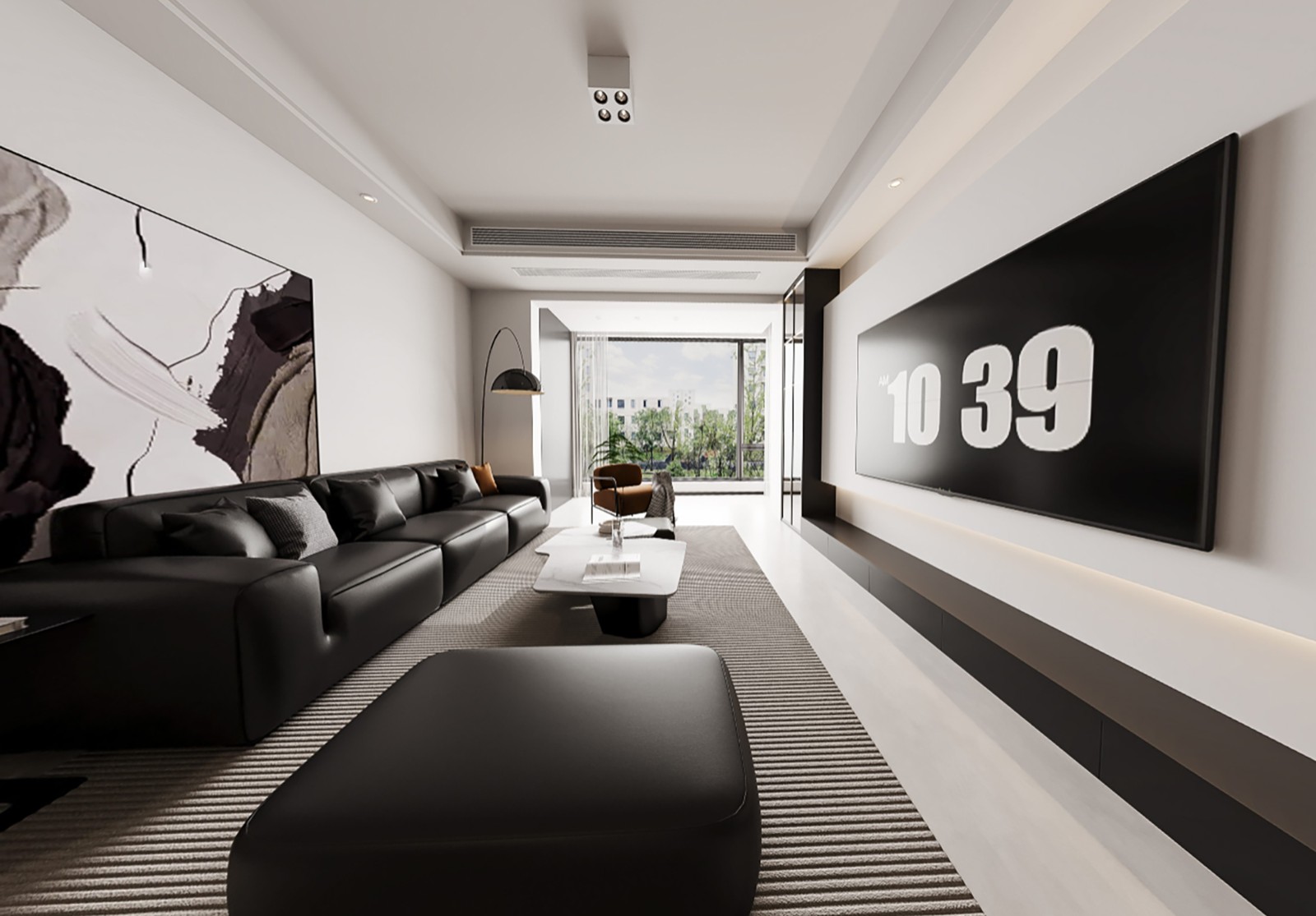 现代风格下的全景呈现,黑色沙发延长布局,适配多人休憩;大尺寸电视墙与线性灯光结合,强化空间纵深感;背景墙艺术画与灯具呼应,空间通透开阔