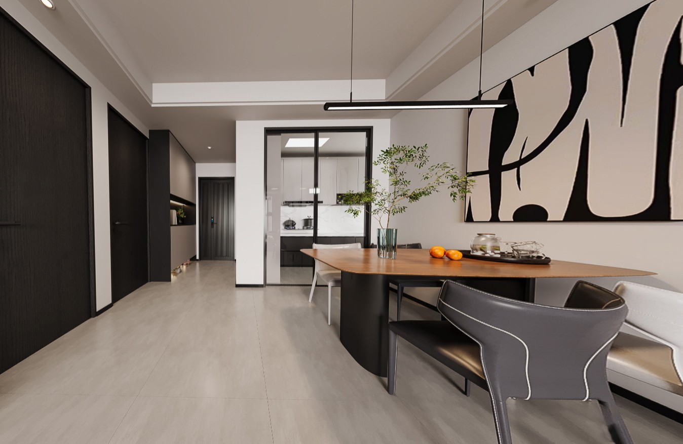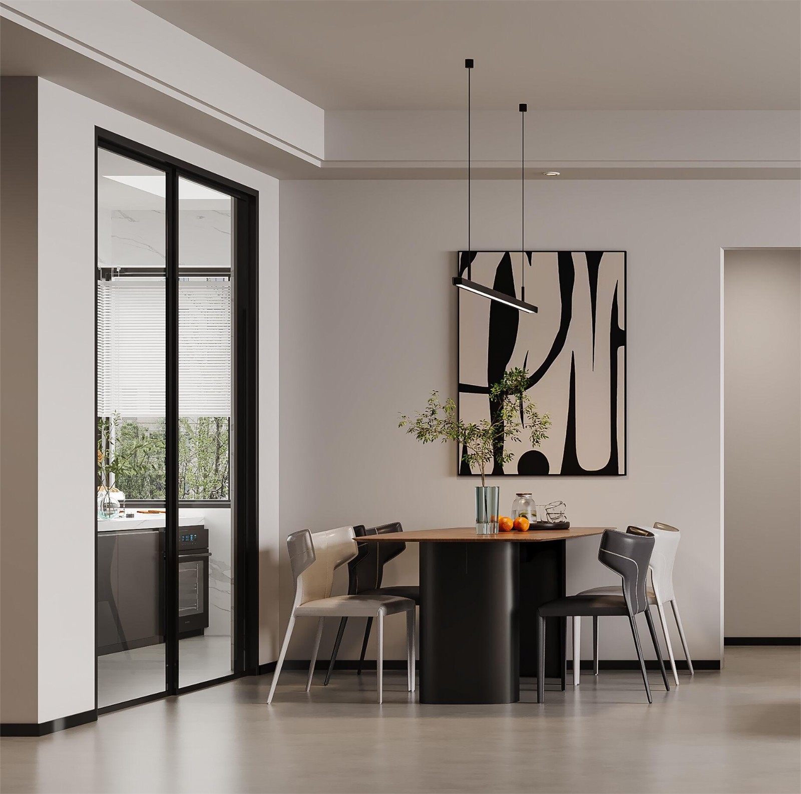 采用现代简约风格,木质餐桌搭配黑白灰餐椅,造型别致;艺术挂画与线性吊灯提升美学层次,旁侧玻璃推拉门衔接厨房,空间过渡自然,整体是兼具用餐与空间衔接功能的雅致场所。