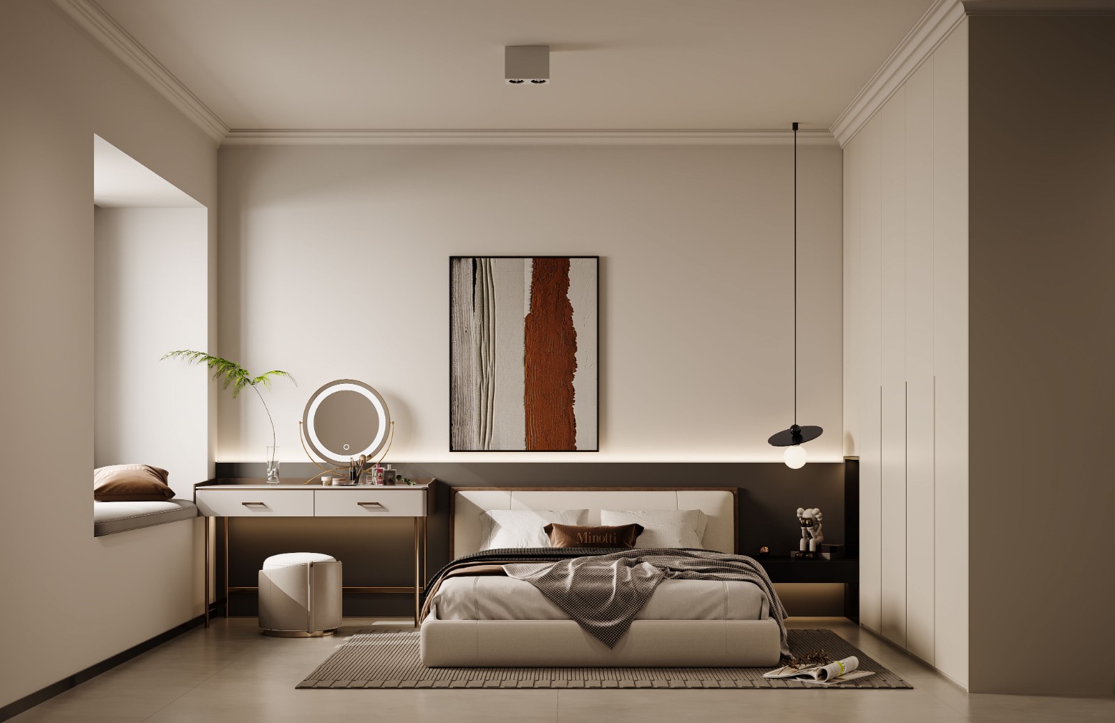 浅米色基调搭配艺术挂画,质感柔和;设梳妆台与带灯镜,满足梳妆需求;飘窗区域可作休憩,定制柜体提供充足收纳,是温馨休憩场所,细节处彰显品质感。
