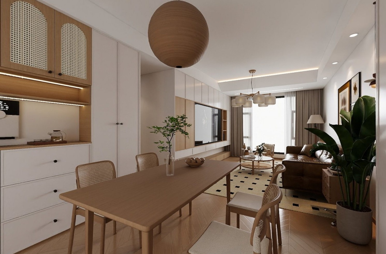 以原木风为核心,客餐厅一体布局,构建通透流畅的生活场所。餐厅区,浅木色长桌搭配藤编餐椅,传递自然温度,餐边柜融合收纳与展示,陈列咖啡器具,增添生活仪式感。客厅区,棕色皮质沙发、圆形小几与几何地毯组合,电视墙嵌入柜体,实现功能与美学统一;