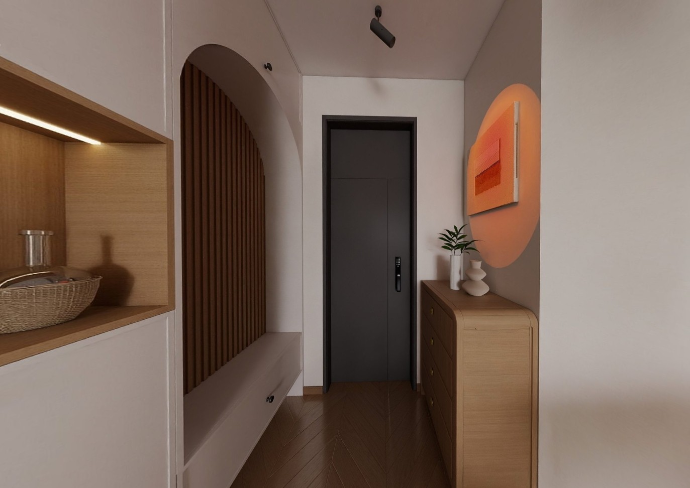 以原木风为基底,弧形门洞、木色格栅与浅木色柜体搭配,呈现温馨过渡氛围。开放格陈列装饰篮、小物,底部抽屉满足收纳,圆形壁灯、艺术挂画与绿植,传递生活温度,整体借自然材质与柔和线条,打造实用与美学兼具的入户场所 。