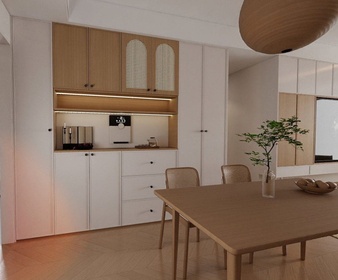 延续原木风自然基调,浅木色柜体搭配白色地柜,呈现简洁收纳氛围。开放格陈列咖啡器具、装饰瓶,底部灯带增添层次,藤编餐椅呼应风格,让餐边柜成为餐厅与客厅过渡的实用美学节点,实现收纳充分;