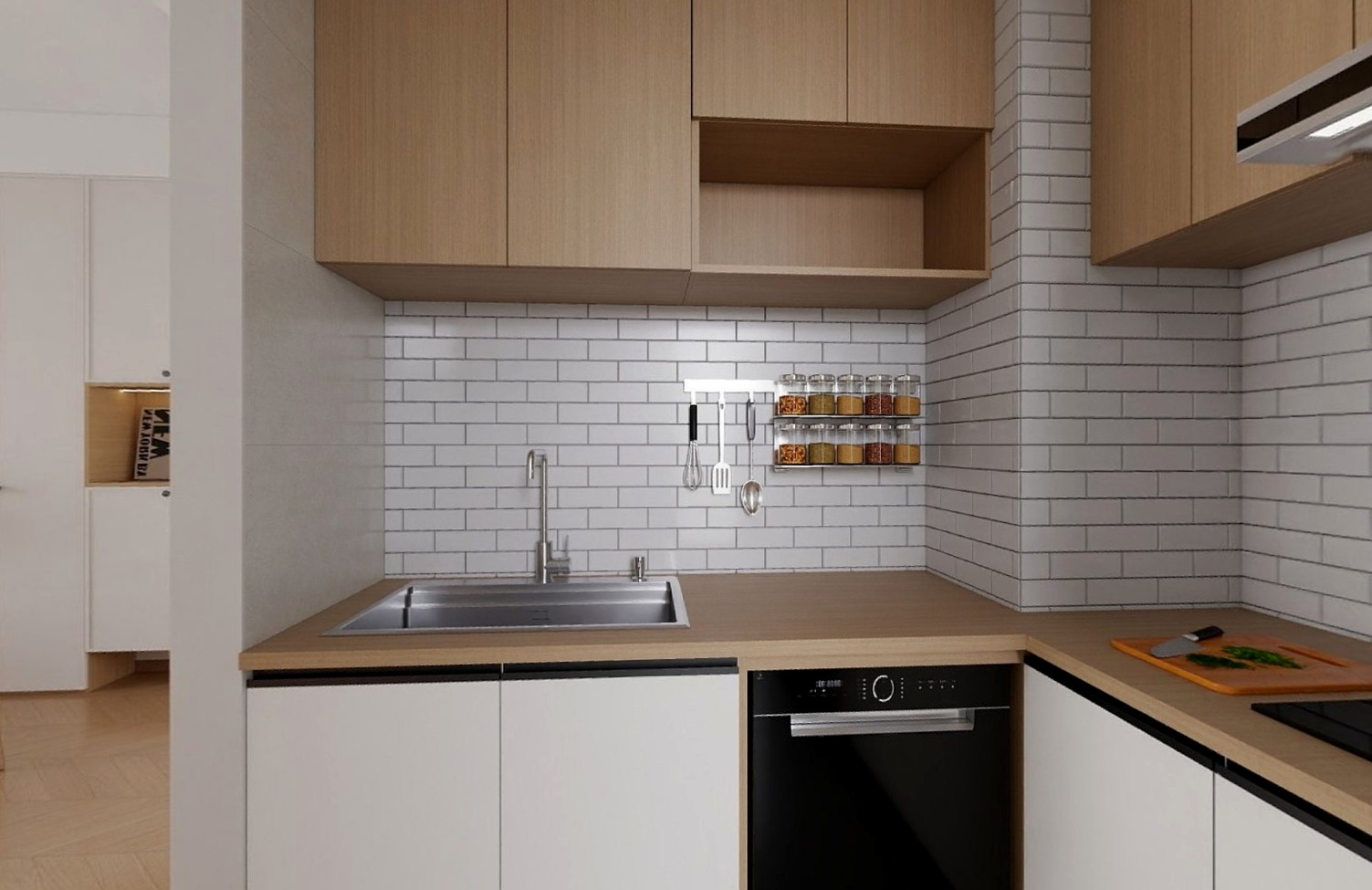采用实用 L 型布局,浅木色台面搭配白色墙砖,呈现干净质朴质感。开放式收纳架陈列调料、厨具,提升使用便利,地柜与吊柜满足充足收纳,洗碗机嵌入,优化烹饪流程,大面操作区借自然光线,构建功能优先、格调统一的烹饪空间 。