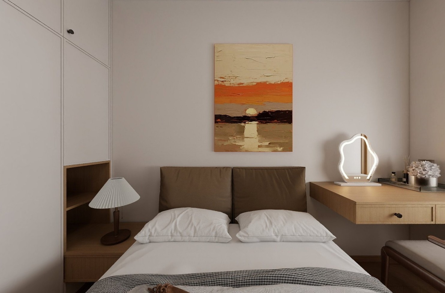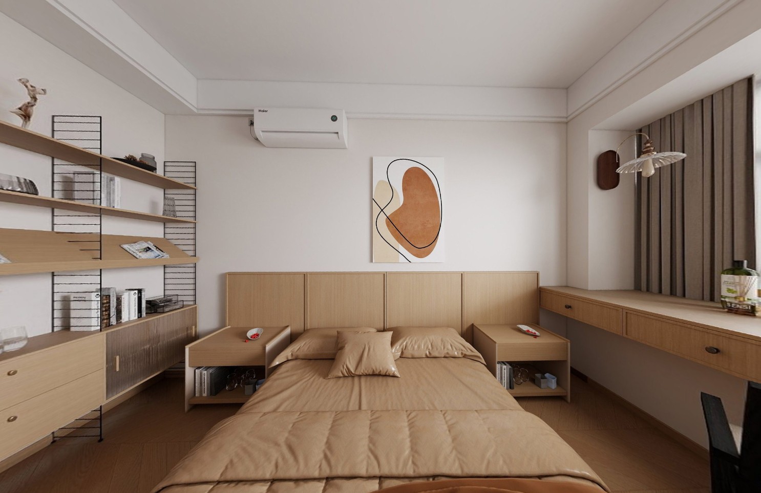 原木风基底搭配浅棕床品,营造自然睡眠氛围。悬浮式床头柜、墙面艺术挂画,增添精致感,一体化书桌与储物柜,满足收纳学习、办公等功能,大面窗户引入光线,构建功能齐全的休憩空间 。
