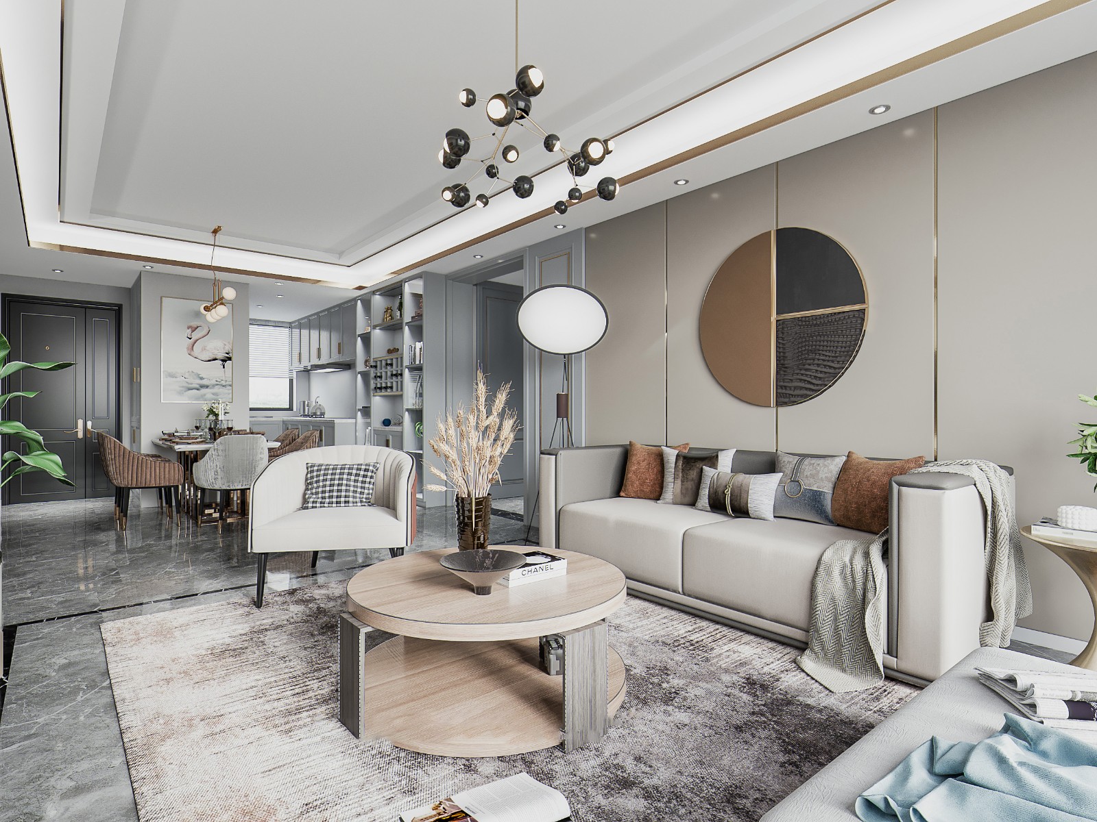 现代轻奢风格的全景呈现,大理石电视墙搭配金属线条强化质感,独特吊灯设计吸睛;空间通透开阔,软装层次丰富,是家庭互动、社交休闲的核心场所,材质与色调的搭配尽显奢华雅致。