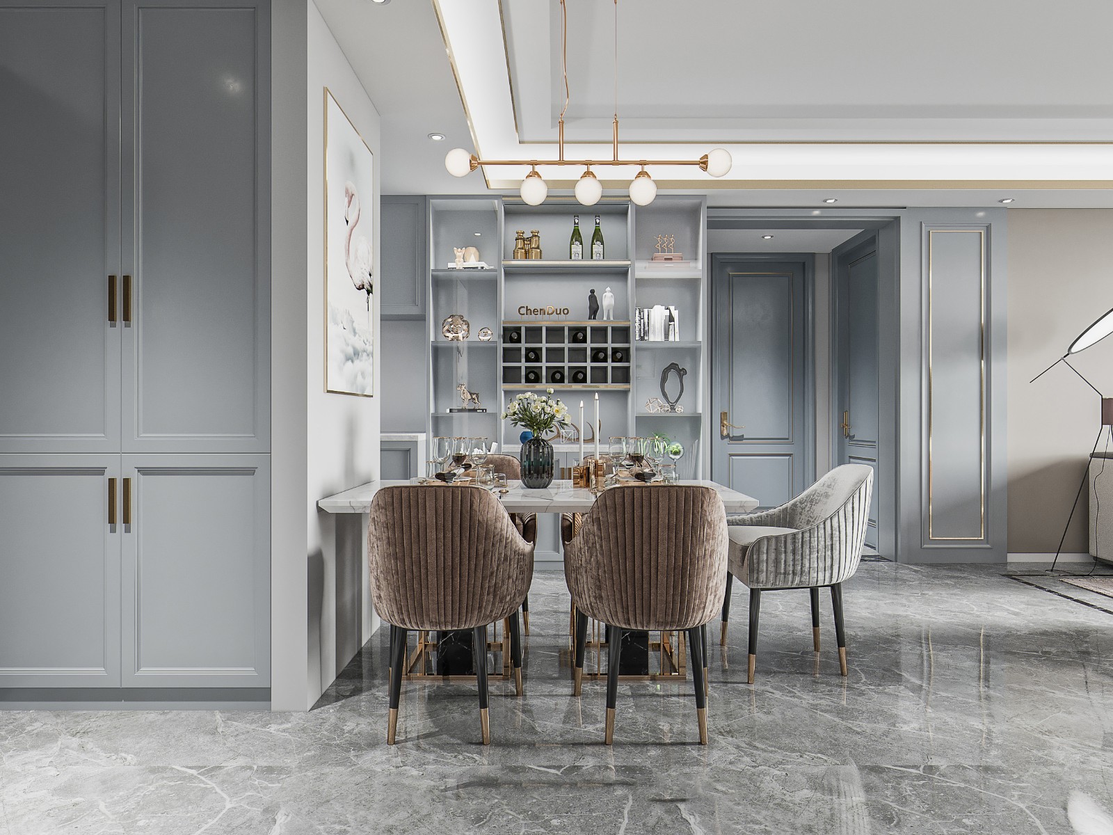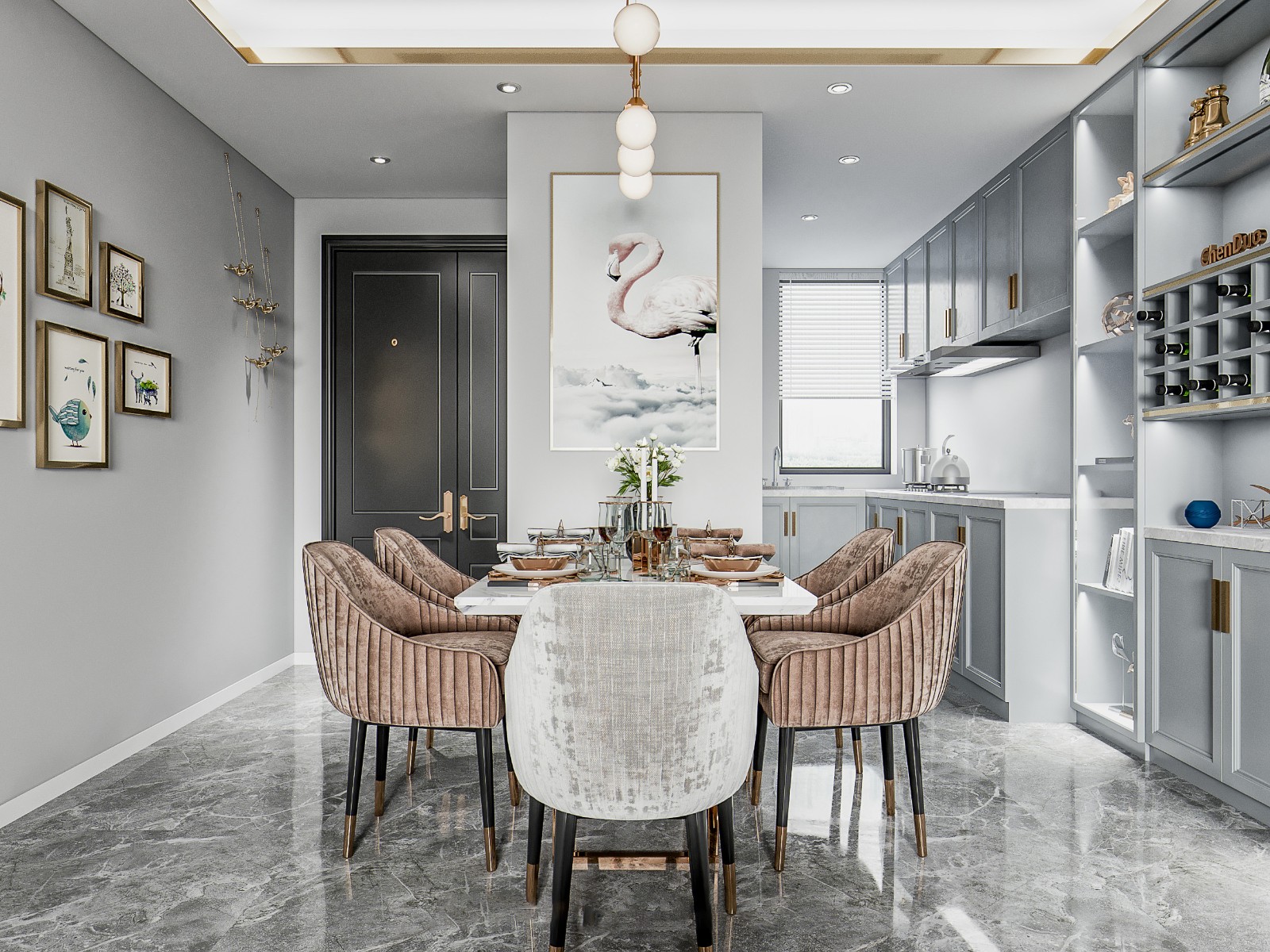 采用现代轻奢风格,灰金配色凸显质感。质感餐椅搭配大理石纹理餐桌,艺术挂画与球形吊灯提升美学层次;旁侧酒柜与厨房衔接自然,兼具用餐与收纳功能,是社交用餐的雅致场所。