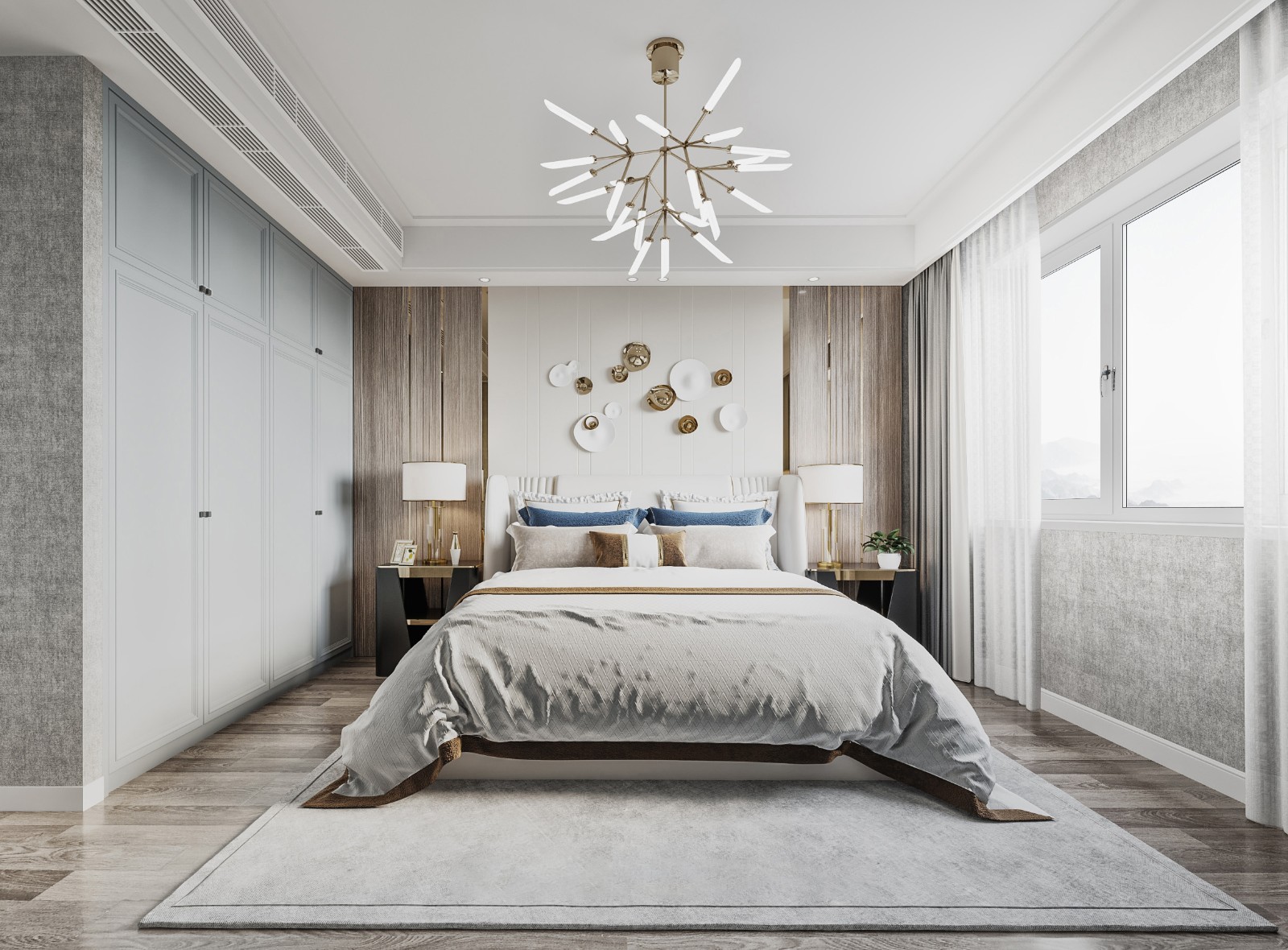 延续现代轻奢风格,独特的枝形吊灯富有设计感,床头区域结合木质与金属元素,装饰画与圆形摆件搭配和谐;定制柜体规整收纳,空间色调统一,营造出温馨且具奢华感的休憩氛围。
