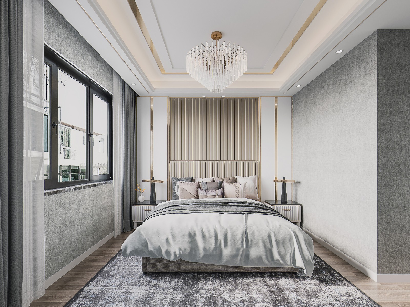 以灰金为主色调营造奢华质感。水晶吊灯设计精致,床头背景墙采用竖纹材质搭配金属线条,软装层次丰富,旁侧大窗保障采光,整体是兼具雅致与舒适的休憩场所。