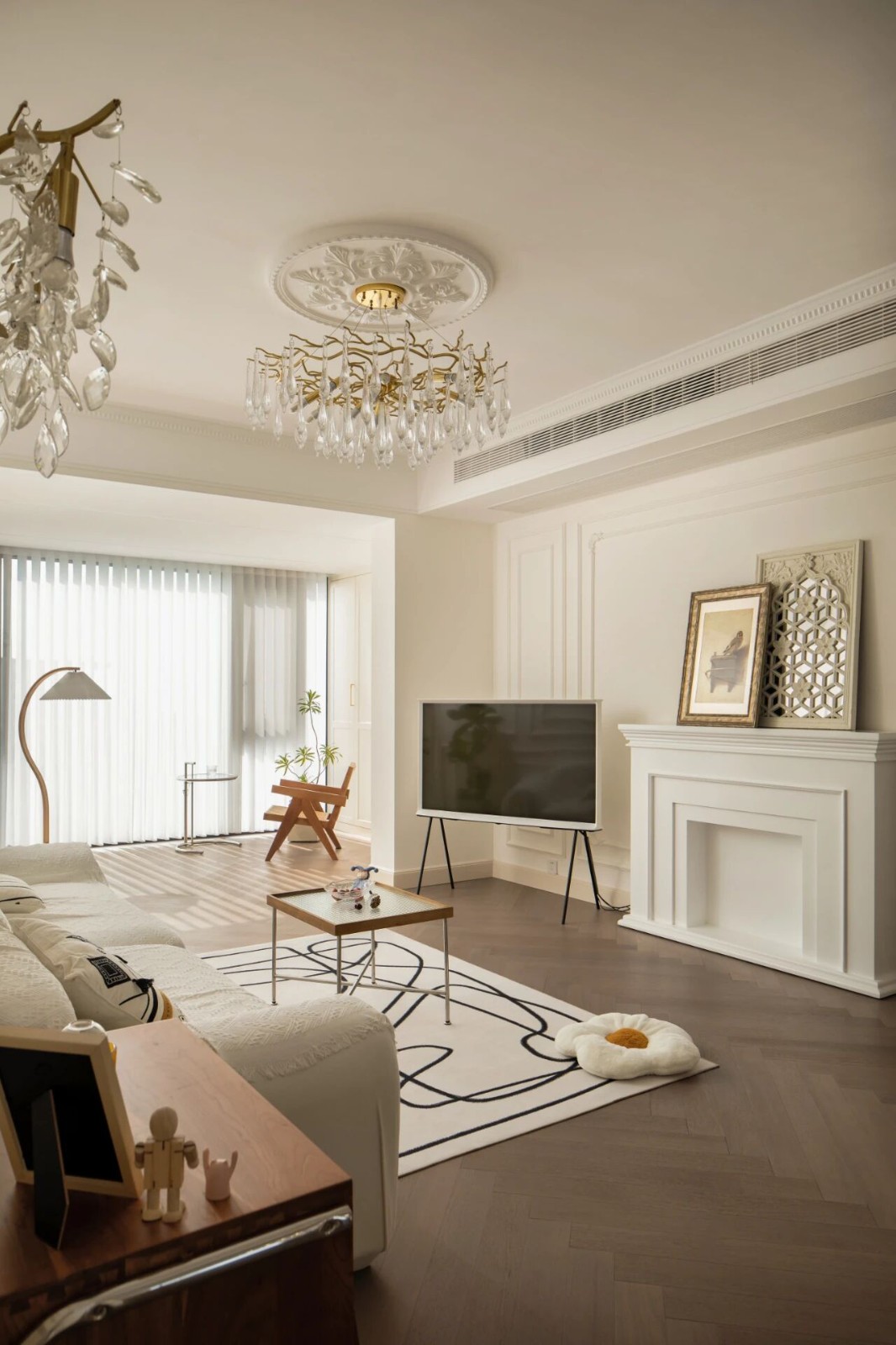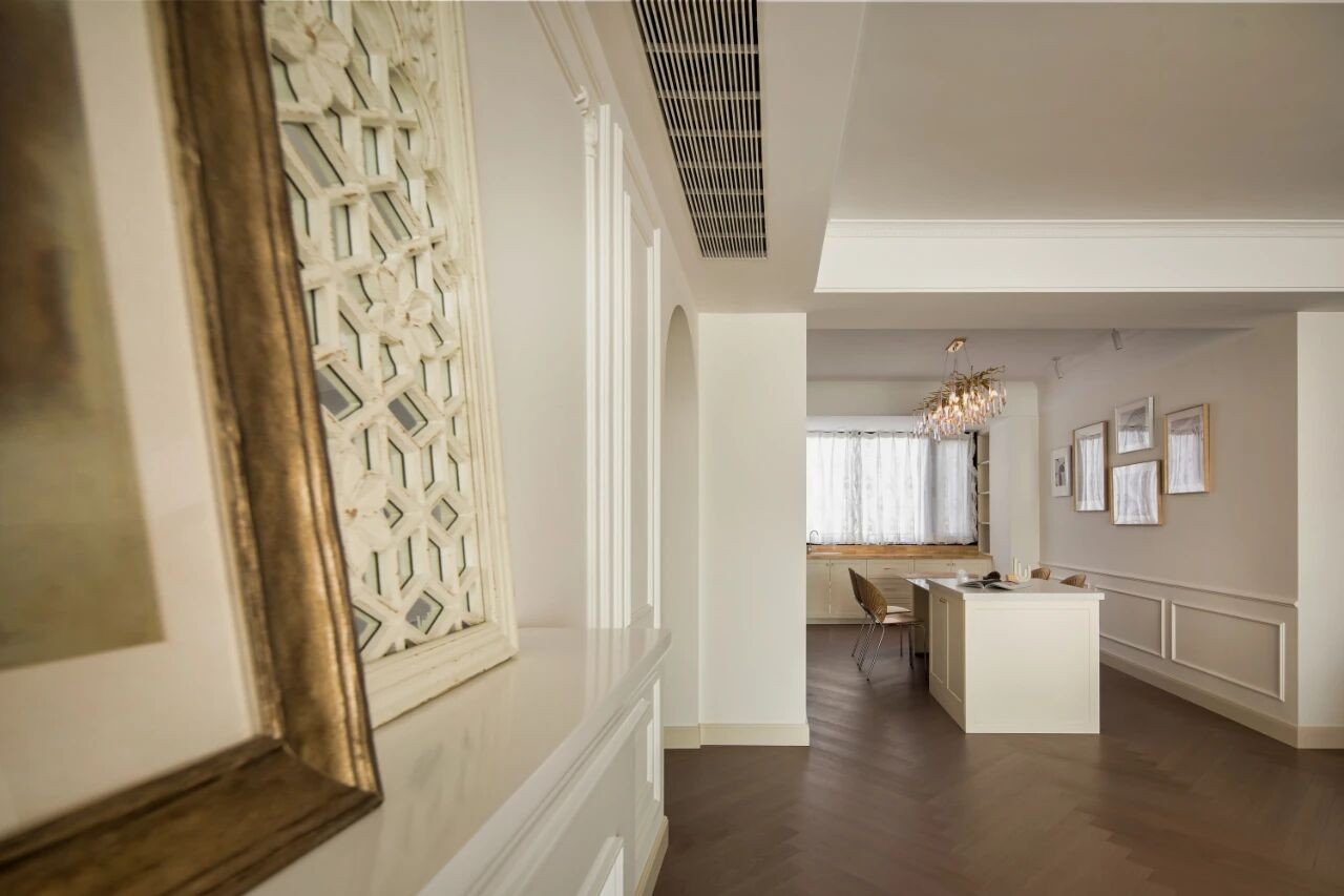 素净的石膏线搭配雕花,橡木色的鱼骨拼地板拉长了空间的纵深感。